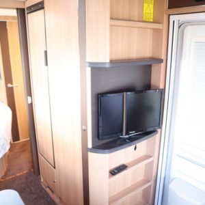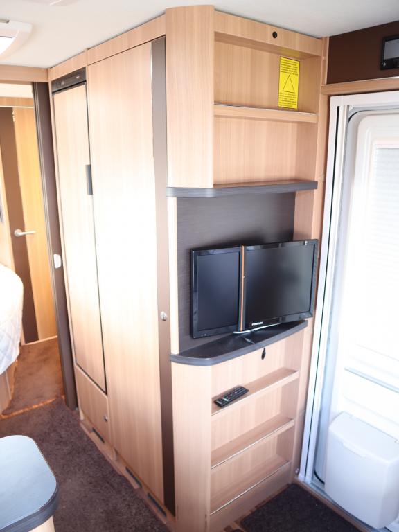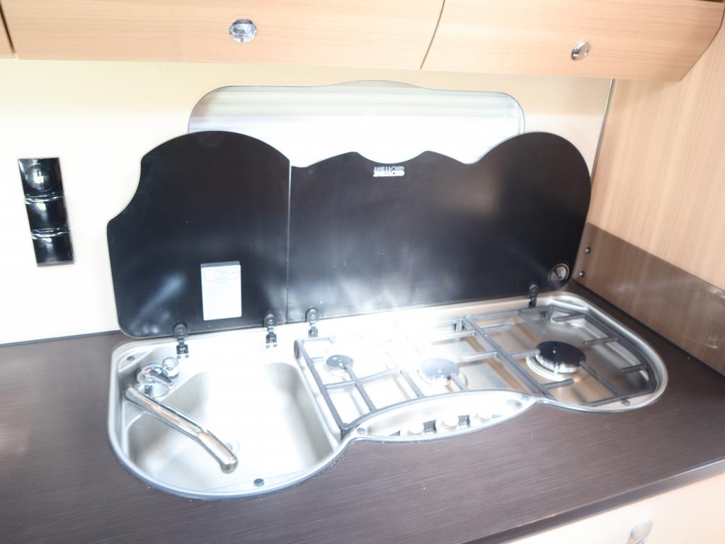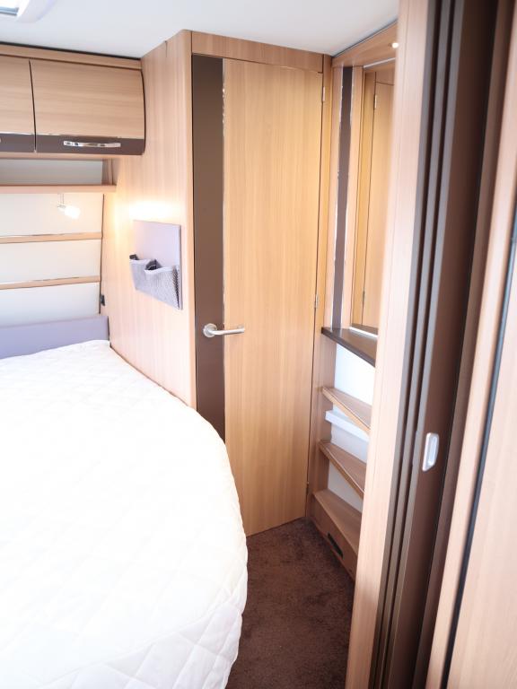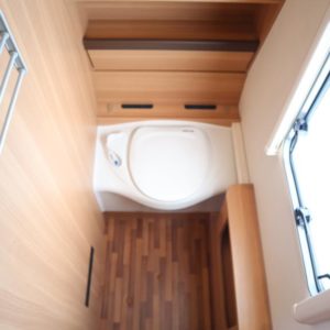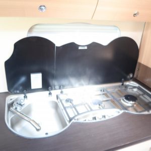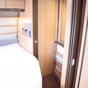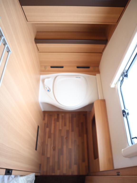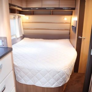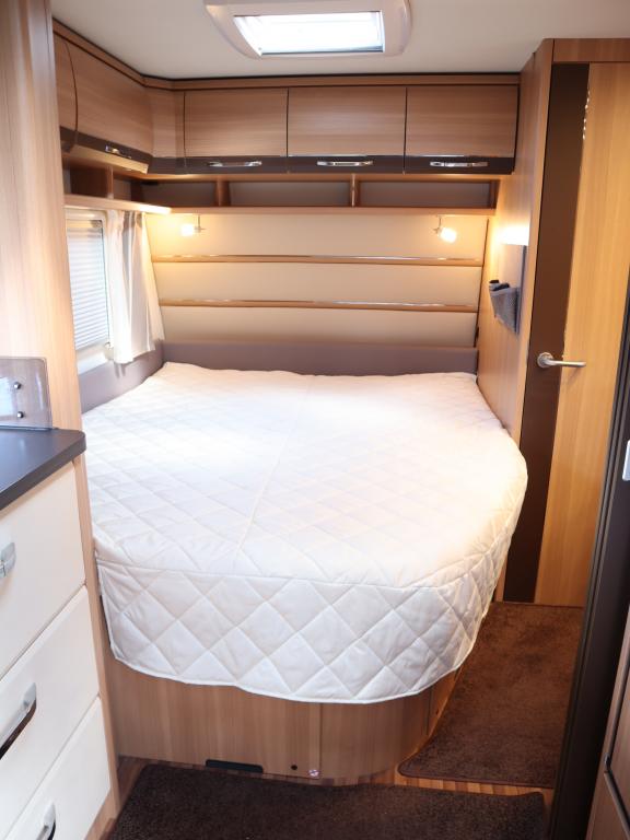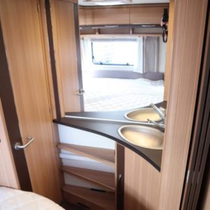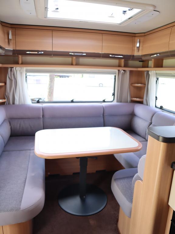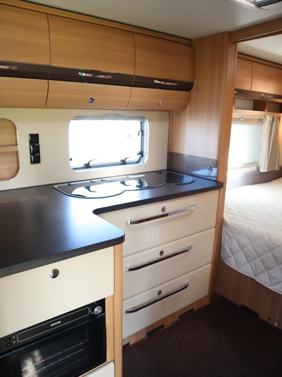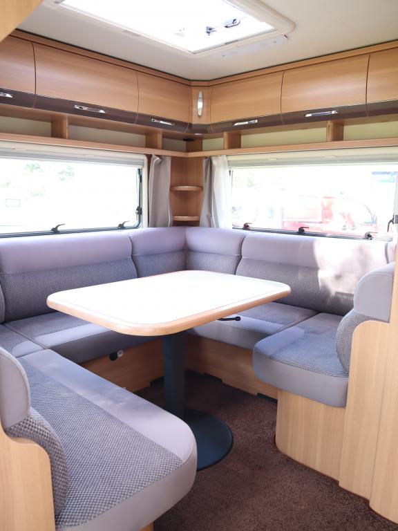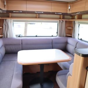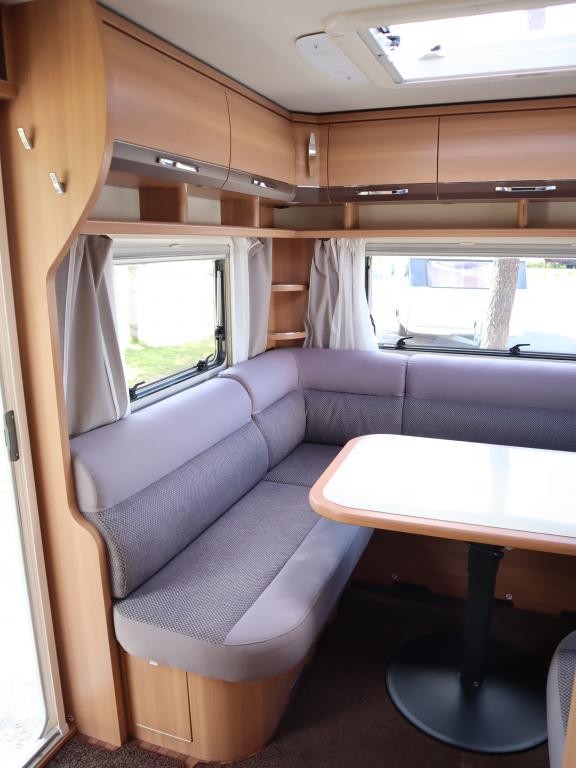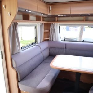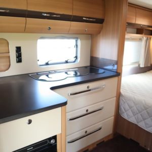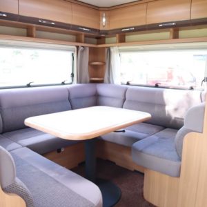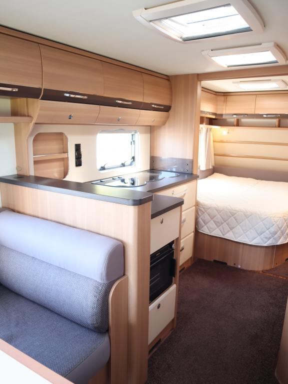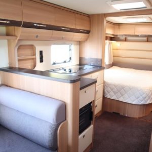 Vaunun etuosassa pitkittäinen vuode ja WC, takaosassa viihtyisä U- ryhmä. Vaunun keskeltä löytyvän keittiön varustuksen täydentää korkea jääkaappi ja kaasu- uuni.