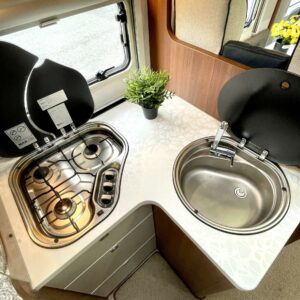 Auton etuosassa on viihtyisä pöytäryhmä. Kääntyvien etuistuinten ja lyhyen sivusohvan ansiosta pöydän ympärille mahtuu mukavasti kuusi henkeä maailman menoa ihmettelemään. Etuosaan saa käden käänteessä lisää makuupaikkoja katosta laskeutuvan nostovuoteen avulla.
