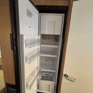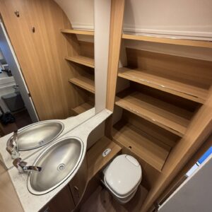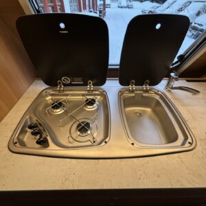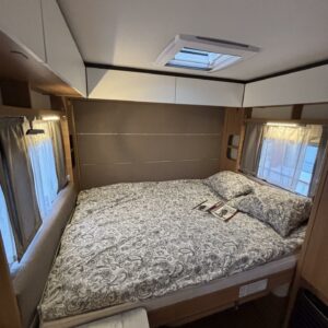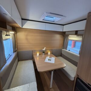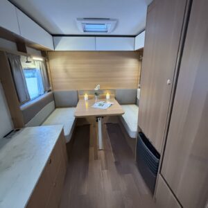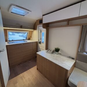 Nyt on näppärä ja ketterä paketti minkä vetämiseen ei veturiltakaan vaadita urotekoja. Vaunu on lattia-alaltaan uskomattoman avaran oloinen. Osasyy tähän on se, että vuode on kätevästi asemoitu ”päiväasennossa” pystyyn takaseinälle. Kun sitten tulee nukkumaanmenoaika, niin pöytä vaan ylös omaan telineeseen ja vuode sitten takaseinältä alas ja siinä se on siinä. Keskeltä vaunua löytyy reilun kokoiset vetolaatikot omaava ”TV taso”. Keittiö on sijoitettu vaunun etuosaan ja keittiön vieressä on WC-tilat. Näihin tehoneliöihin on saatu varusteltua kaikki matkailuajaneuvon perusvarusteet ja jääkaappikin on mallia korkea. Oikein siistikuntoinen tapaus, melkein voisi lähteä jopa ”vaihtoehto” uudelle linjalle tämän tapauksen kanssa. Vaunulla on ollut vain yksi käyttäjäomistaja.