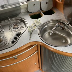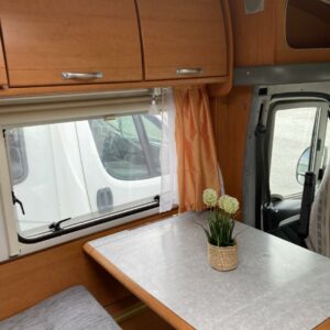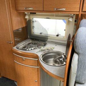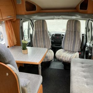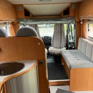 Takana parivuode pitkittäin ja vieressä pesuhuone, keskellä L-keittiö ja iso jääkaappi-pakastin, edessä istunryhmä 6:lle kääntyvin ohjaamon penkein.
