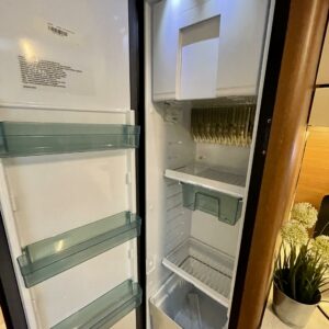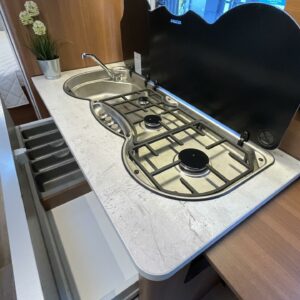 Hyvin varusteltu keittiö liesineen ja suurella jääkaapilla antaa loistavat mahdollisuudet ruoanlaittoon myös pidemmillä reissuilla.