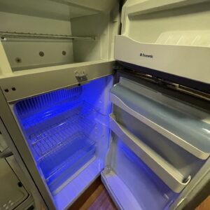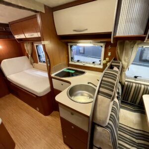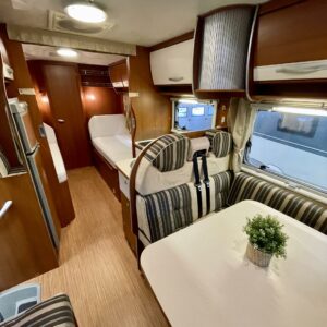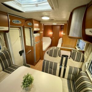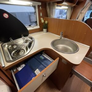 Oleskelutila on avara ja kutsuva. Suuret pinnat ja toimiva pohjaratkaisu tekevät sisätilasta valoisan ja viihtyisän, olitpa sitten iltapalalla sateen ropistessa kattoon tai suunnittelemassa seuraavaa etappia. Kunnollinen L-keittiö tarjoaa reilusti laskutilaa ja säilytystä, ja jenkkikokoinen jääkaappi pitää eväät kylmänä pidemmällekin matkalle.