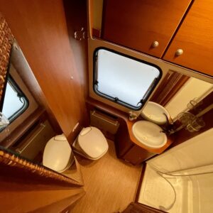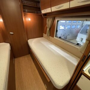 Tässä autossa matkanteko ja asuminen ovat tasapainossa. Matalat erillisvuoteet takaavat mukavat unet ja helpon kulun ilman kiipeilyä. Vuoteiden takana, auton peräosassa, odottaa tilava wc sekä erillinen suihkutila oma rauhallinen spa-hetki keskellä luontoa.