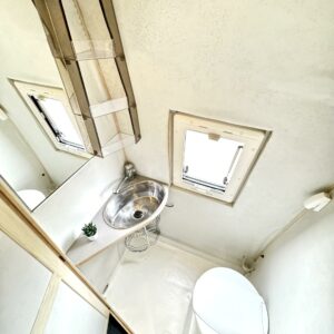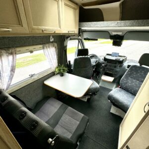 Edessä istuinryhmä neljälle, keskellä keittiö, jossa reilusti laskutilaa ja pesuhuone kasetti-WC:llä. Takana parivuode, jossa sivulle leviävä erkkeri, jonka ansiosta vuode on yli 2m pitkä. Takana monikäyttöinen kalusteseinä ja vuoteen alla suuri tavaratila. Reilusti kaappitilaa kaikkialla.