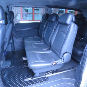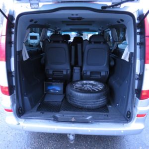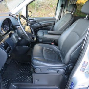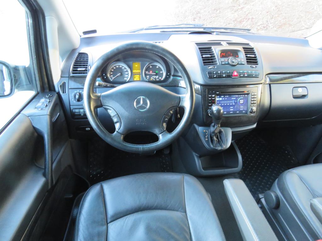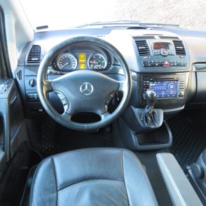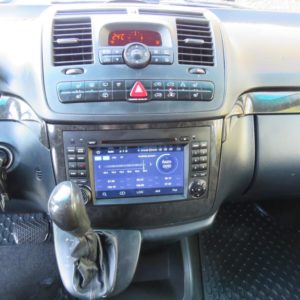 Varusteina mm. Thermotronic ilmastointiautomatiikka, Polttoainekäyttöinen lisälämmitin ajastimella, Lämmitys- ja jäähdytyskanavat myös matkustamoon, Nahkaverhoilu, Pysäköintitutka edessä ja takana, Penkinlämmittimet edessä, Vetokoukku, Liukuovet sekä oikealla että vasemmalla, Jatkuva neliveto… Autossa on tällä hetkellä asennettuna tarvikemallinen Navigointi/Bluetooth/DVD-soitin, mutta mukana on myös alkuperäinen soitin.