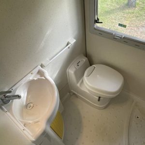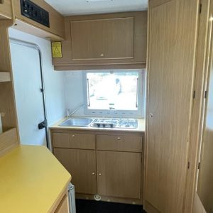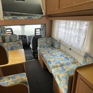 Auton etuosassa leveä alkovivuode, takana keittiö ja pesuhuone/ WC. Auton keskivaihteilta löytyy pitkä sivusohva ja pöytäryhmä neljälle.