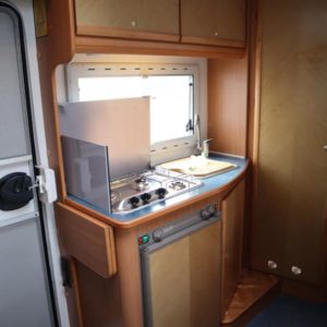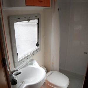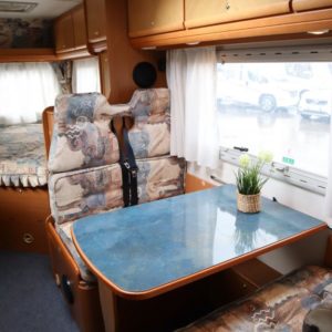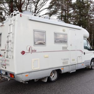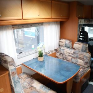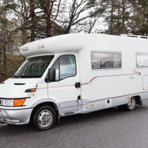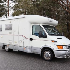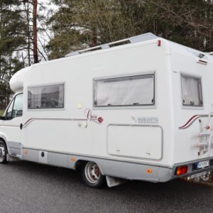 Takaveto Iveco-alustainen 6:lle rekisteröity Mobilvetta. Edessä vastakkain isuttava pöytäryhmä, josta mahdollista pedata vuode. Keskellä keittiö. Perällä parivuode ja tilava WC/suihku-tila.