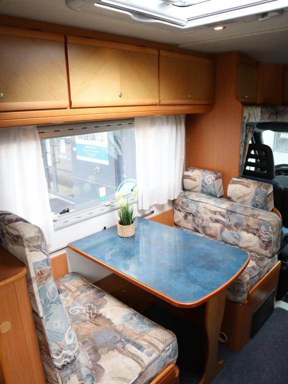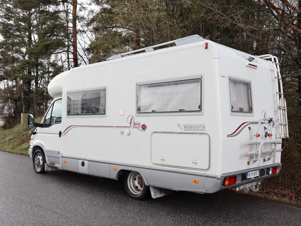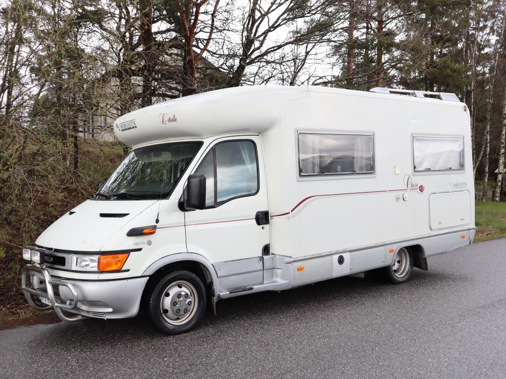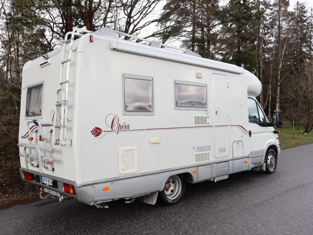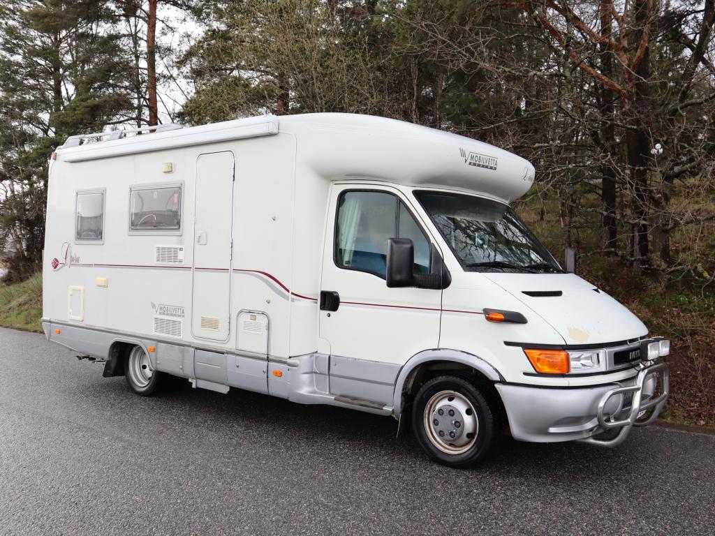 Takaveto Iveco-alustainen 6:lle rekisteröity Mobilvetta. Edessä vastakkain isuttava pöytäryhmä, josta mahdollista pedata vuode. Keskellä keittiö. Perällä parivuode ja tilava WC/suihku-tila.