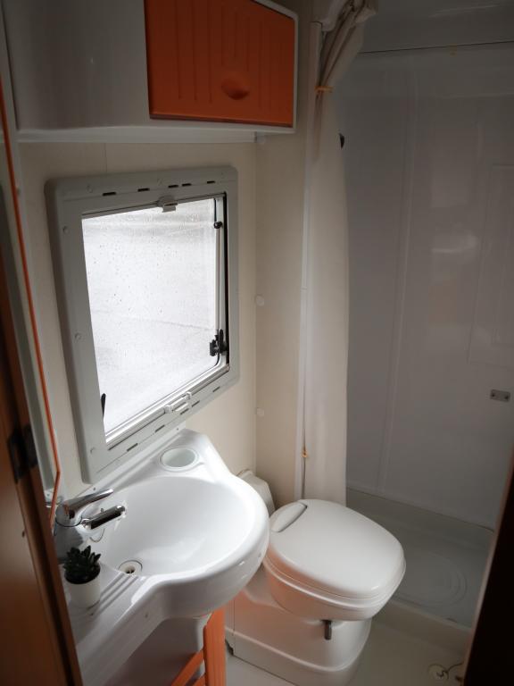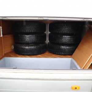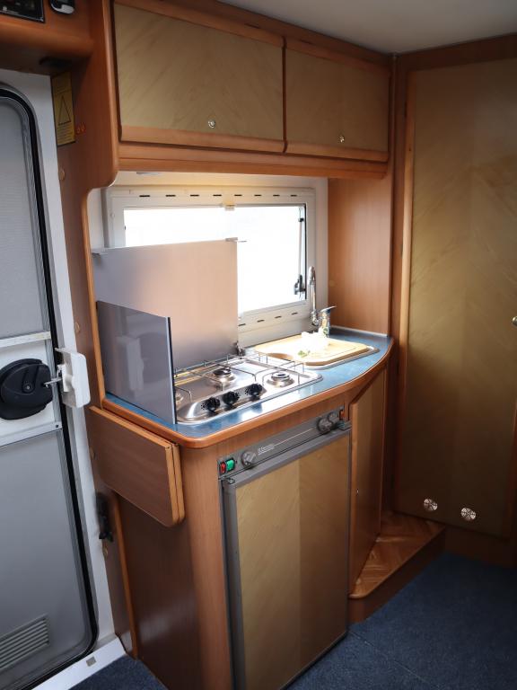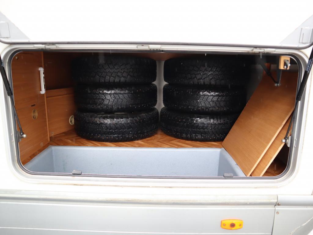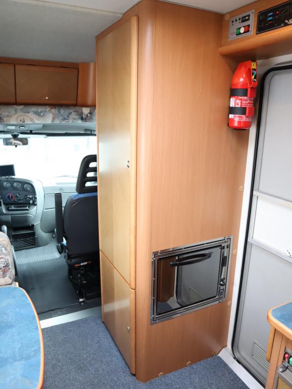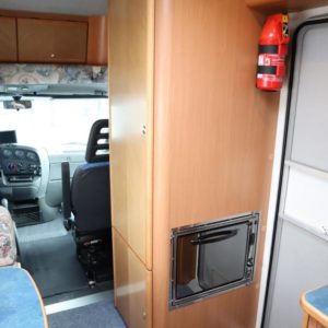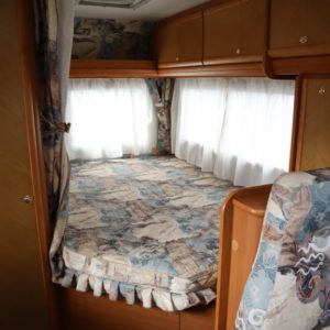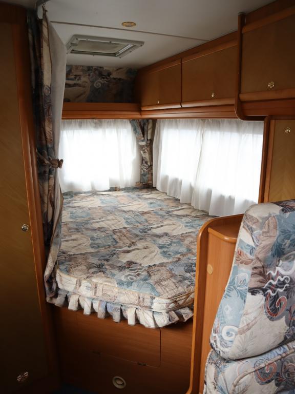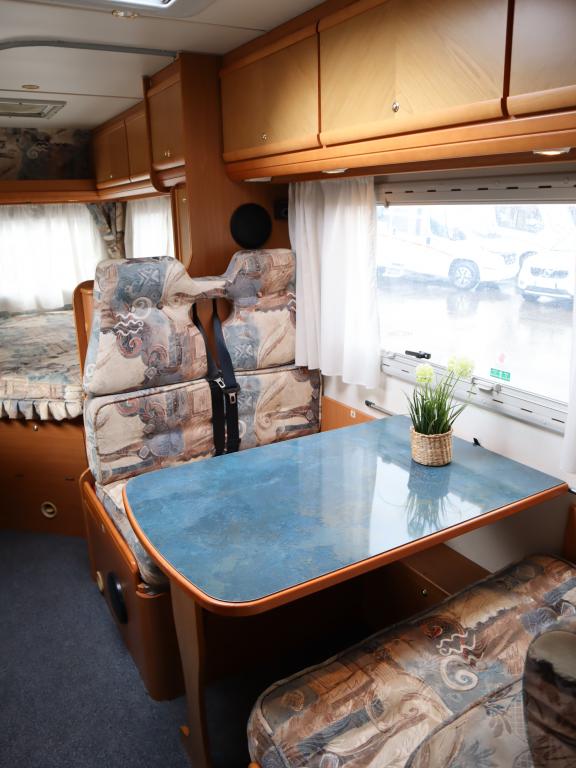 Takaveto Iveco-alustainen 6:lle rekisteröity Mobilvetta. Edessä vastakkain isuttava pöytäryhmä, josta mahdollista pedata vuode. Keskellä keittiö. Perällä parivuode ja tilava WC/suihku-tila.