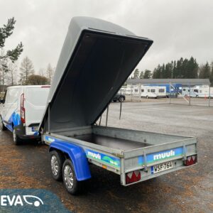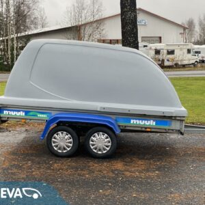 Lavan sisämitat 325 x 140. Sisäpuolella 4kpl kiinnityspisteitä per puoli ja samoin ulkopuolella. Teliakselinen ja lehtijousitettu alusta. Kippaava lava, eli helppo lastata kelkat, mönkkärit ym. ajettavat vehkeet kyytiin. Takalaita sisäpuolelta vaneroitu. Kuomu ja kaikki saranasyystemit hyvässä kunnossa. Pohjavaneri myös todella hyväkuntoinen. Nokkapyöräkin löytyy.