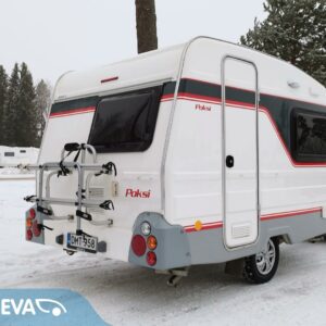 Vaunussa on tummennetut ikkunat sekä pyöräteline kahdelle pyörälle.