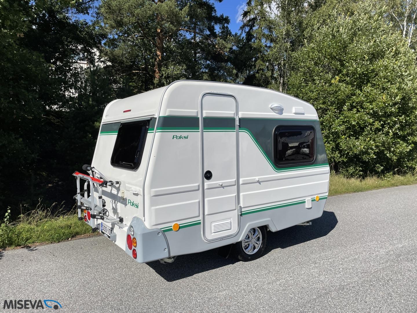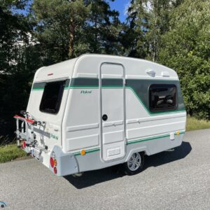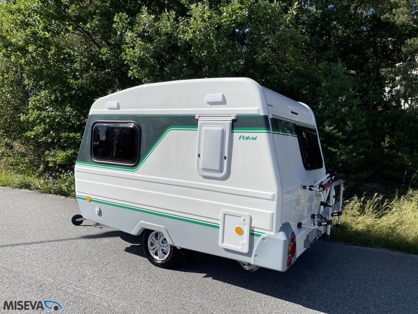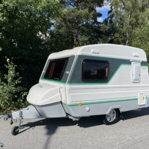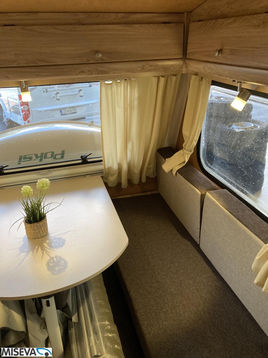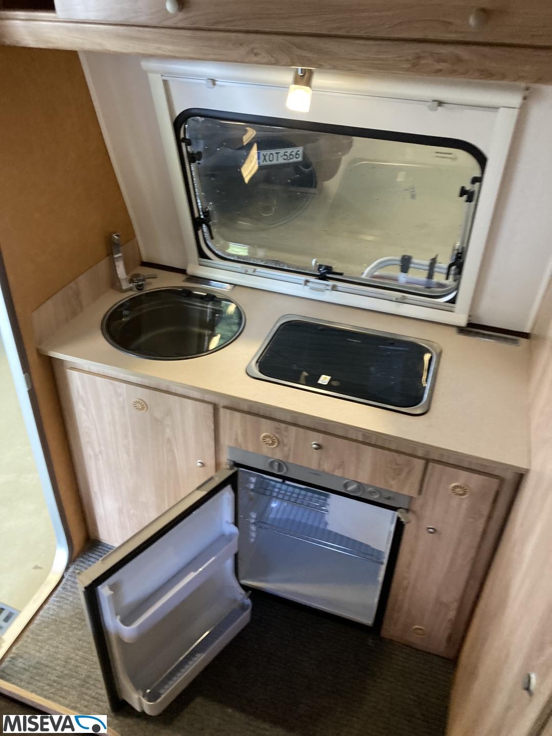 Edessä erillisvuoteet jotka yhdistettävissä, takana päätykeittiö ja pesuhuone. Lisävarusteena etuteltta ja katos