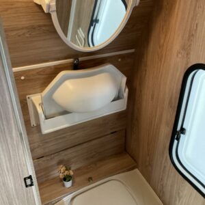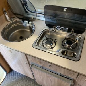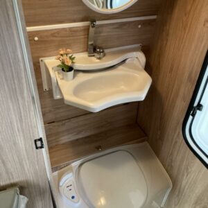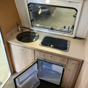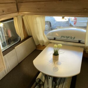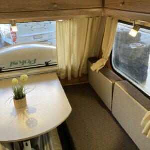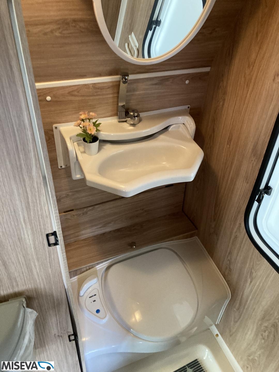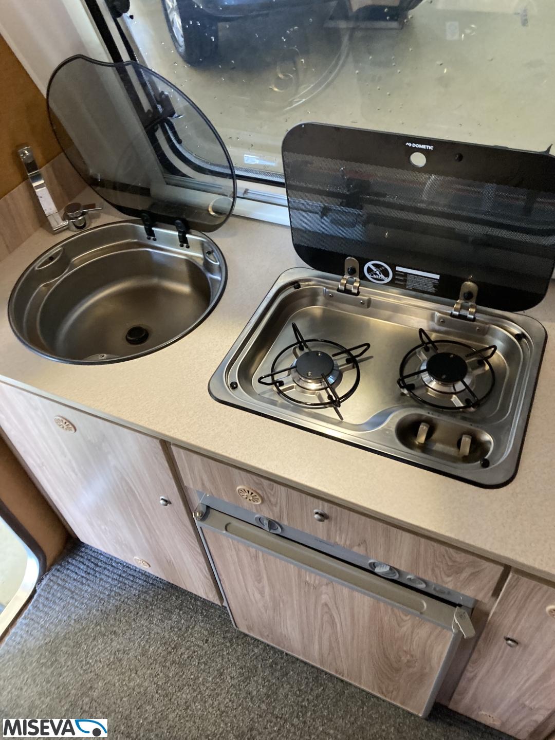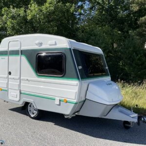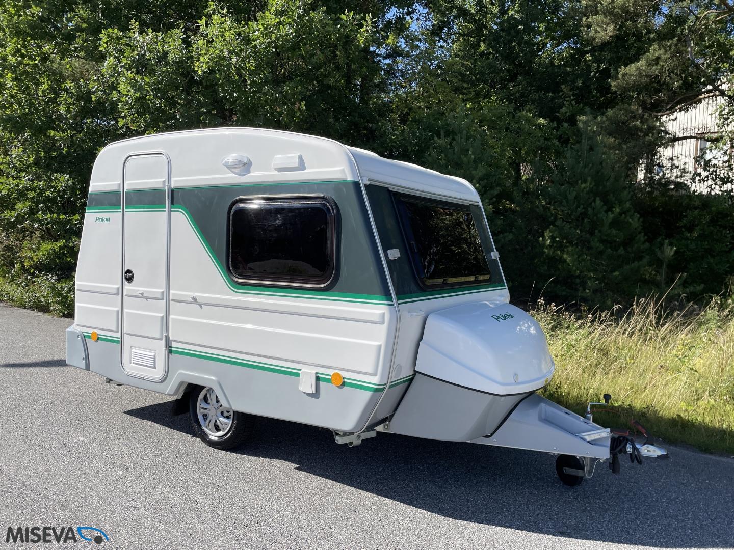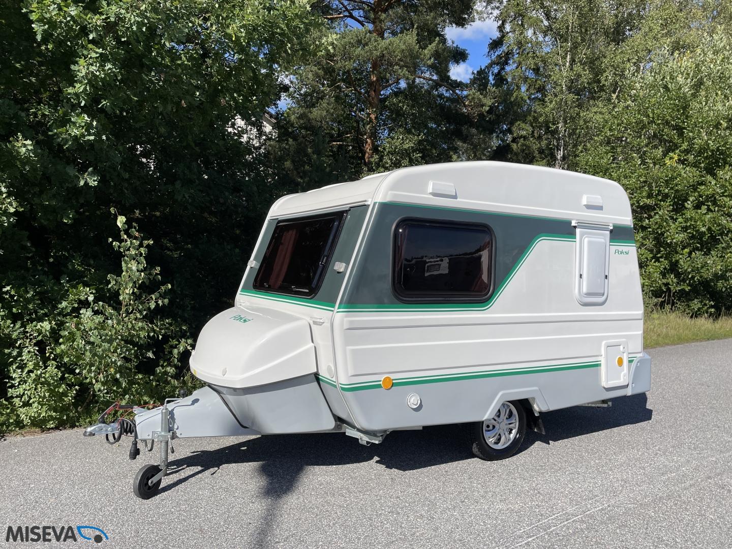 Edessä erillisvuoteet jotka yhdistettävissä, takana päätykeittiö ja pesuhuone. Lisävarusteena etuteltta ja katos