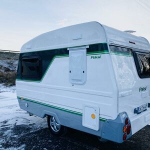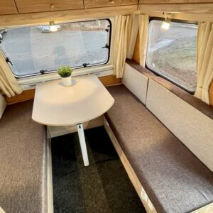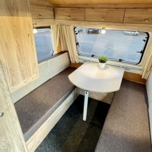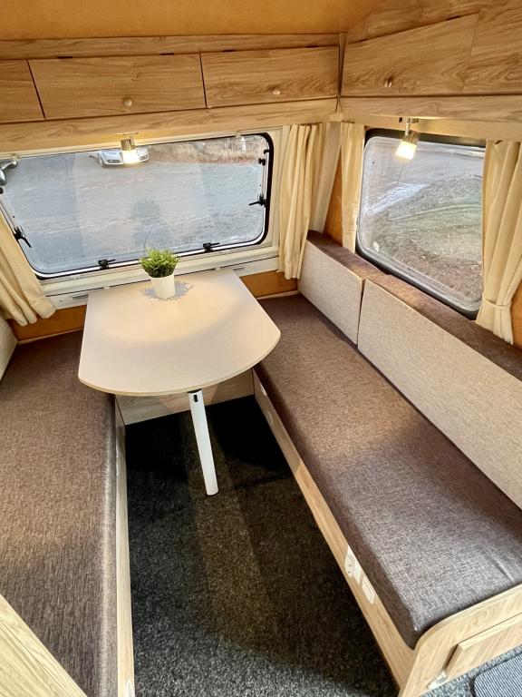 Pohjaratkaisussa takaosassa keittiö ja Wc-tila. Etuosassa sohvaryhmä josta pedattavissa parivuode.
