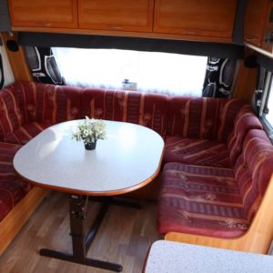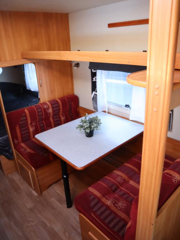 Takana pitkittäin parivuode ja pesuhuone, keskellä keittiö isolla jääkaapilla ja vastapäätä istuinryhmä jonka päällä taittuva kaappi/vuode, edessä tilava U-istuinryhmä.