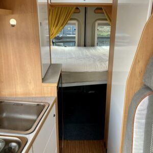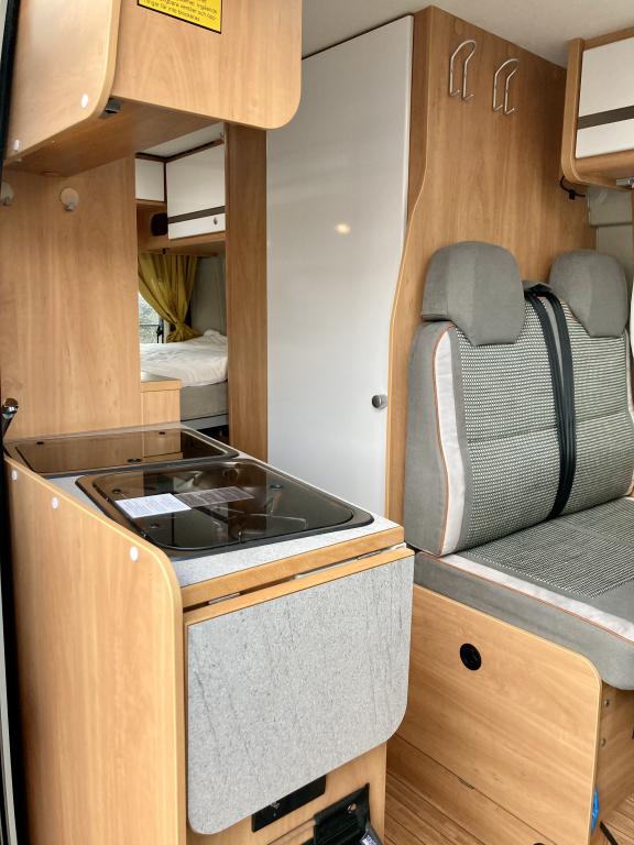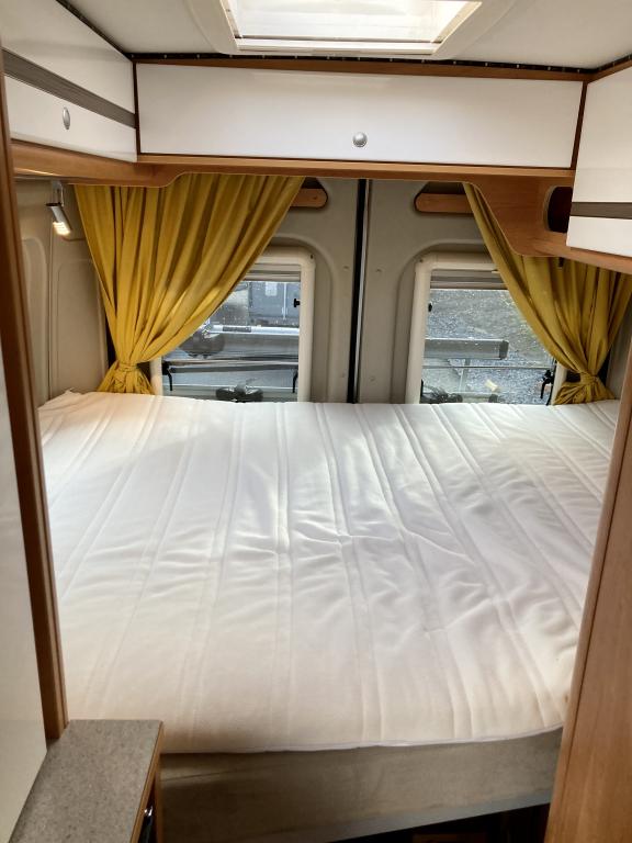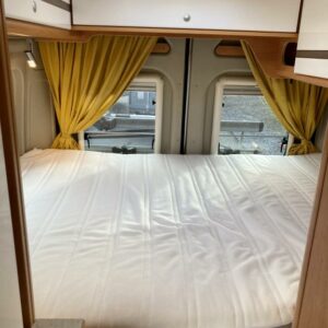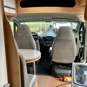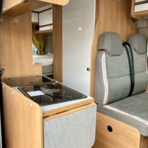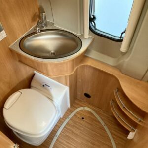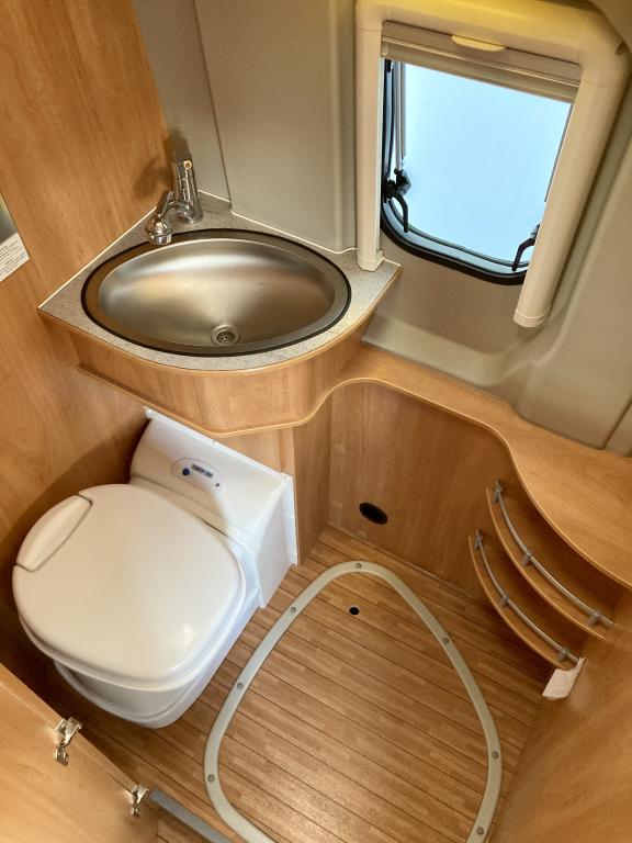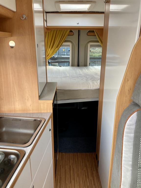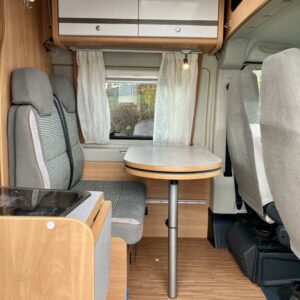 Pohjaratkaisussa edessä sohvaryhmä ja kääntyvät etuistuimet. Keskiosassa keittiö sekä wc -ja suihkutila. Takaosassa poikittainen parivuode.