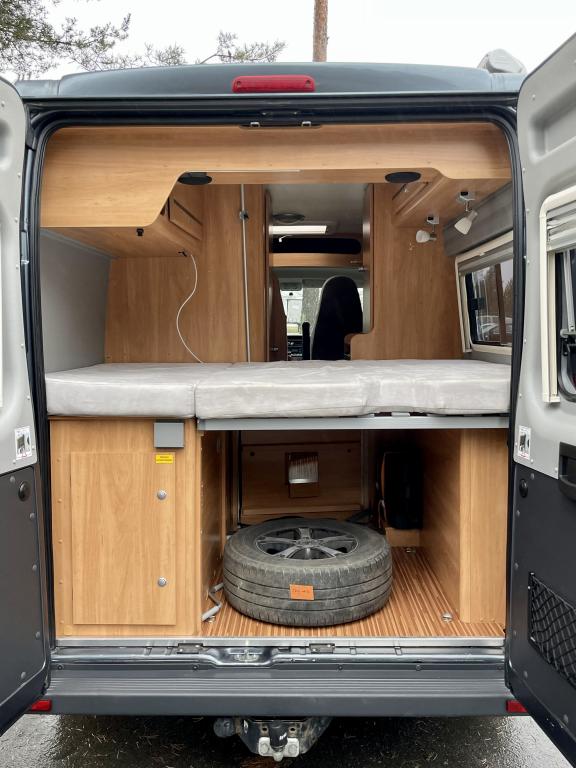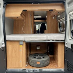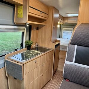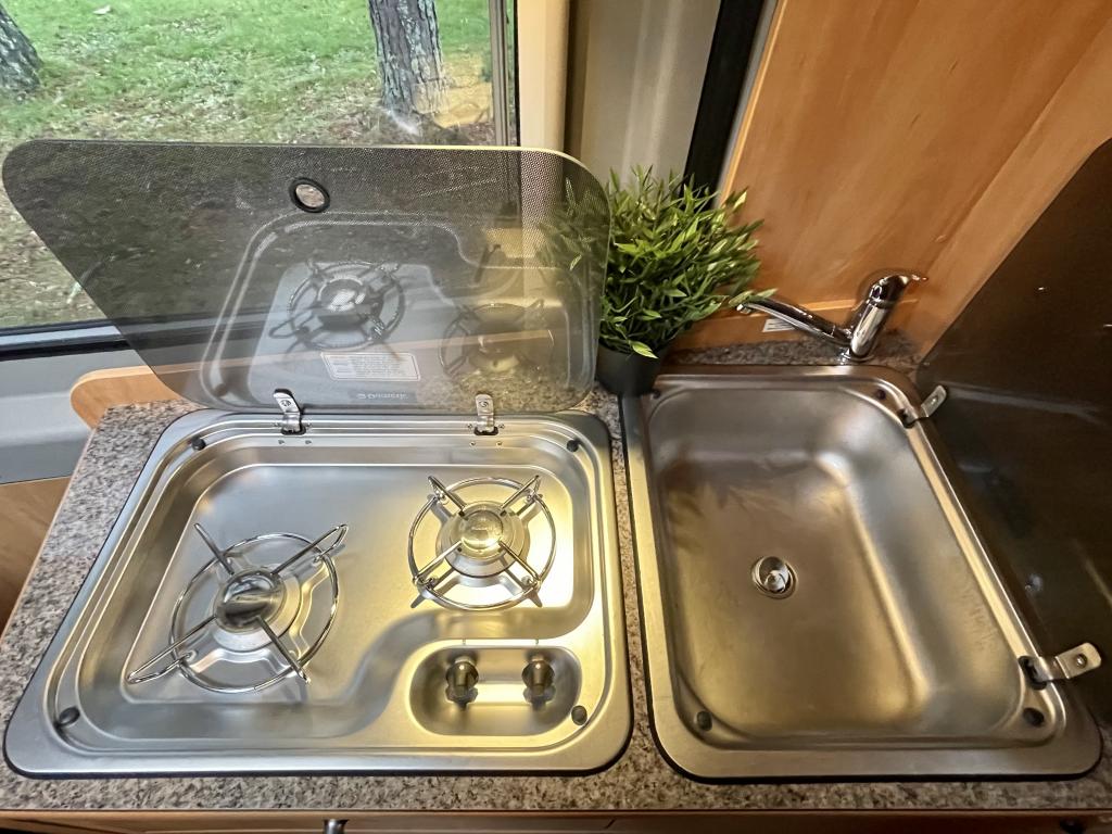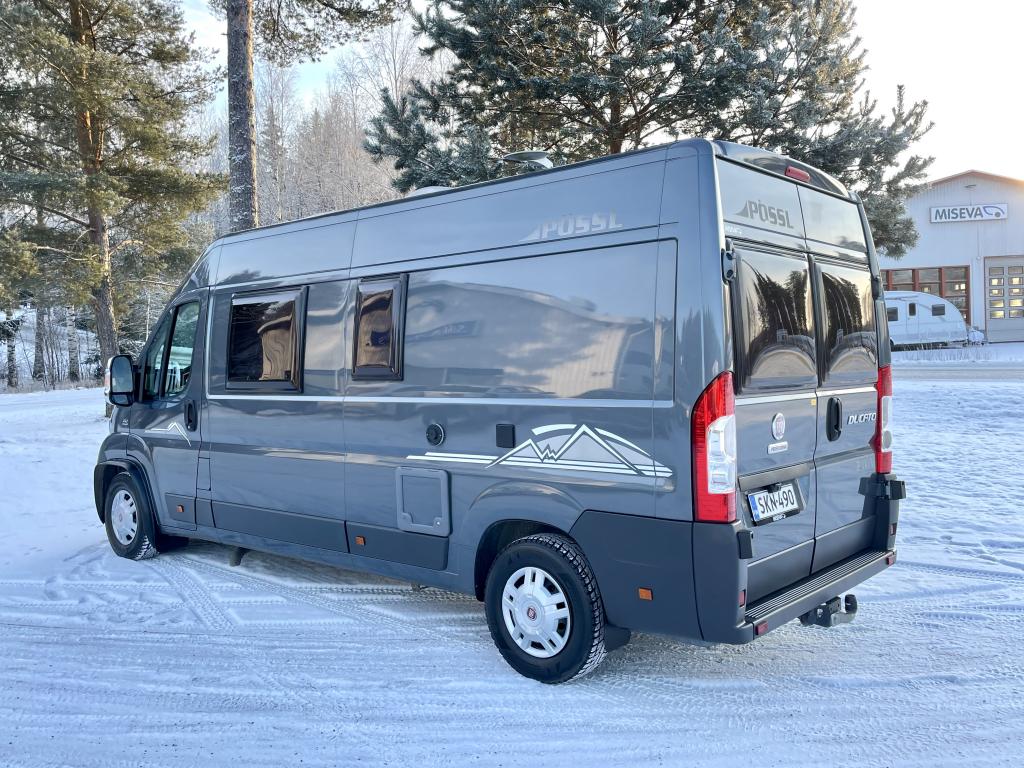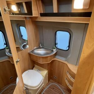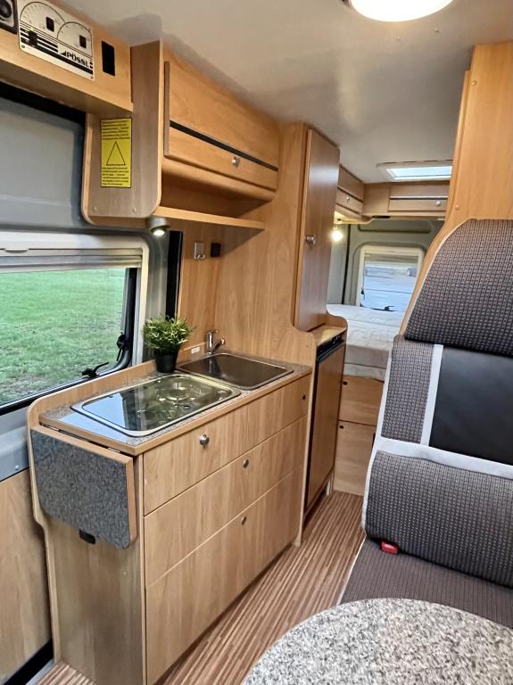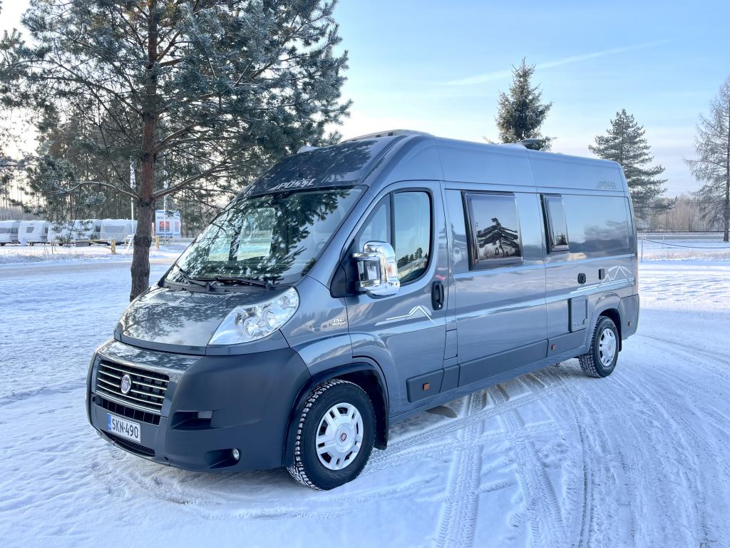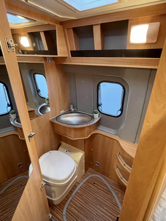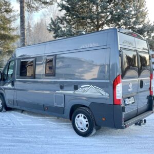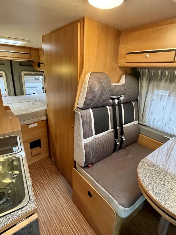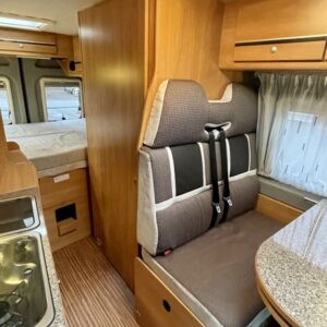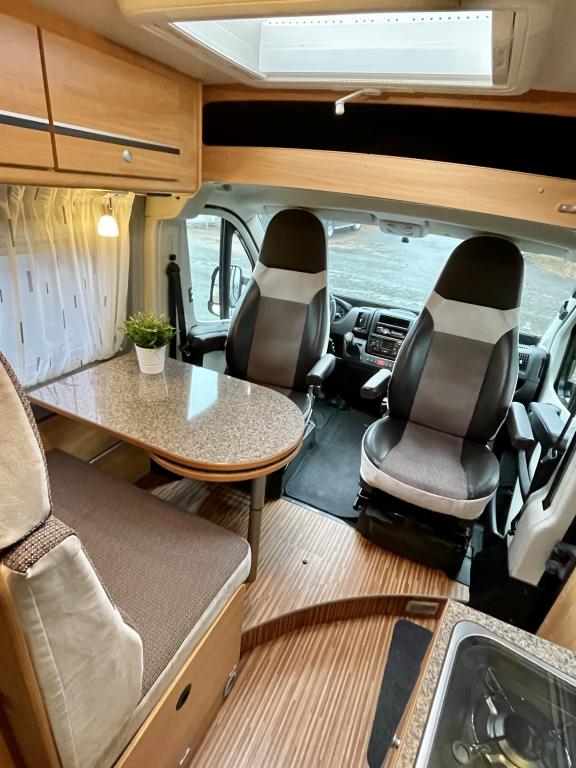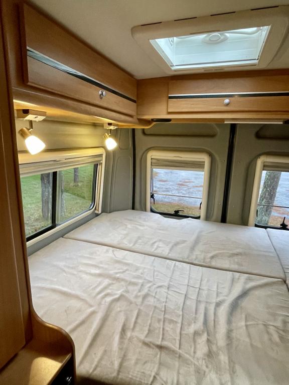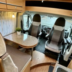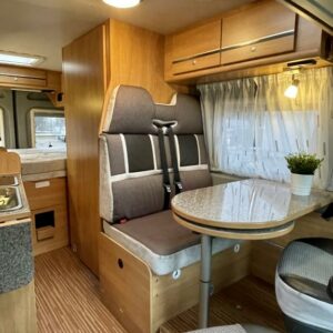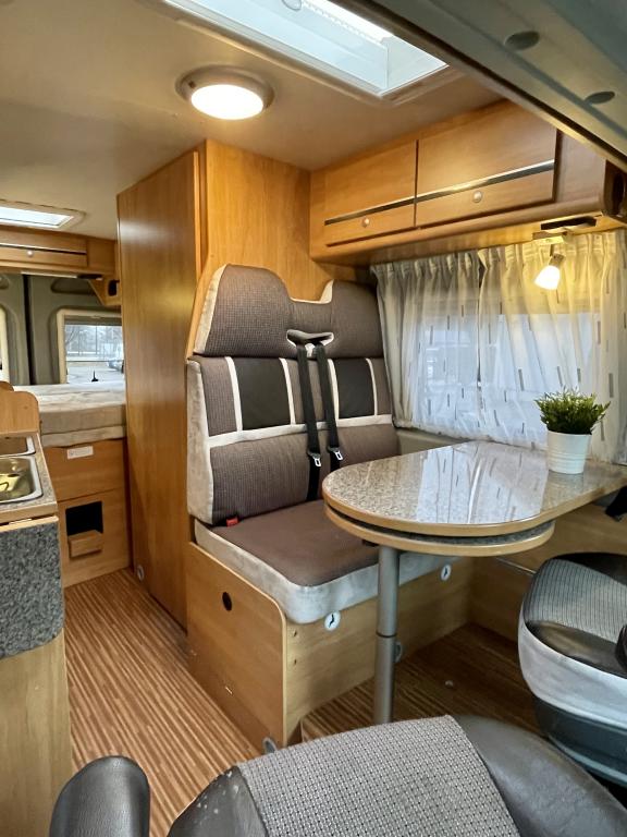 Pohjaratkaisussa etuosassa kääntyvät etuistuimet sekä sohvaryhmä josta pedattavissa lisävuode. Keskiosassa keittiö sekä Wc-tila. Takaosassa poikittainen parivuode jonka alla tavaratila.