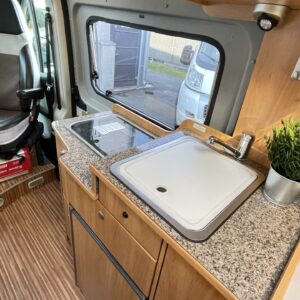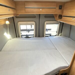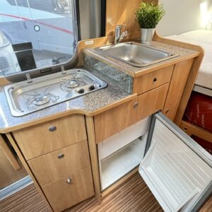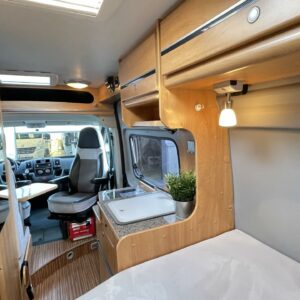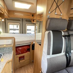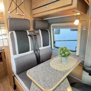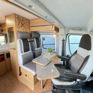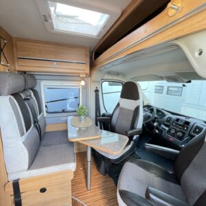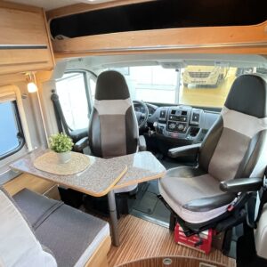 Takana parivuode ja alla hyvä tavaratila, keskellä keittiö ja pesuhuone, edessä istuinryhmä 4:lle kääntyvin ohjaamon penkein.