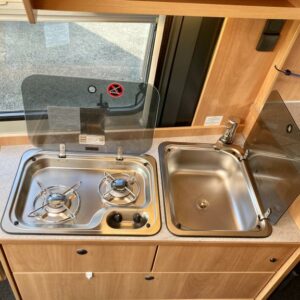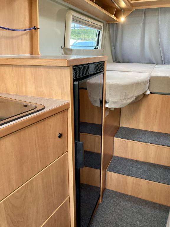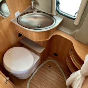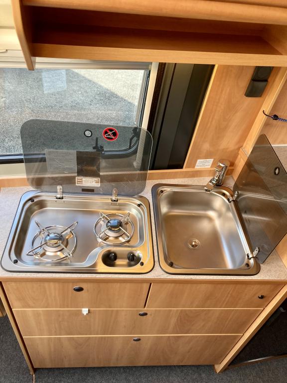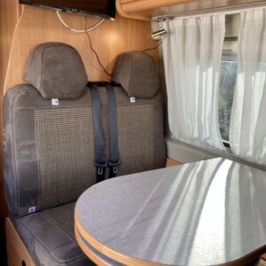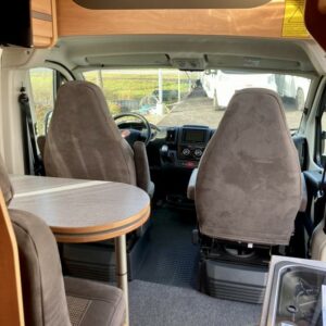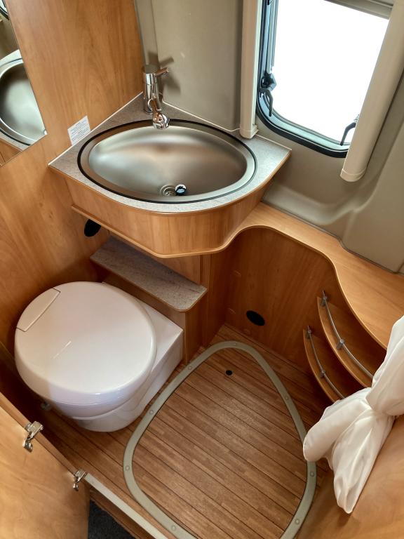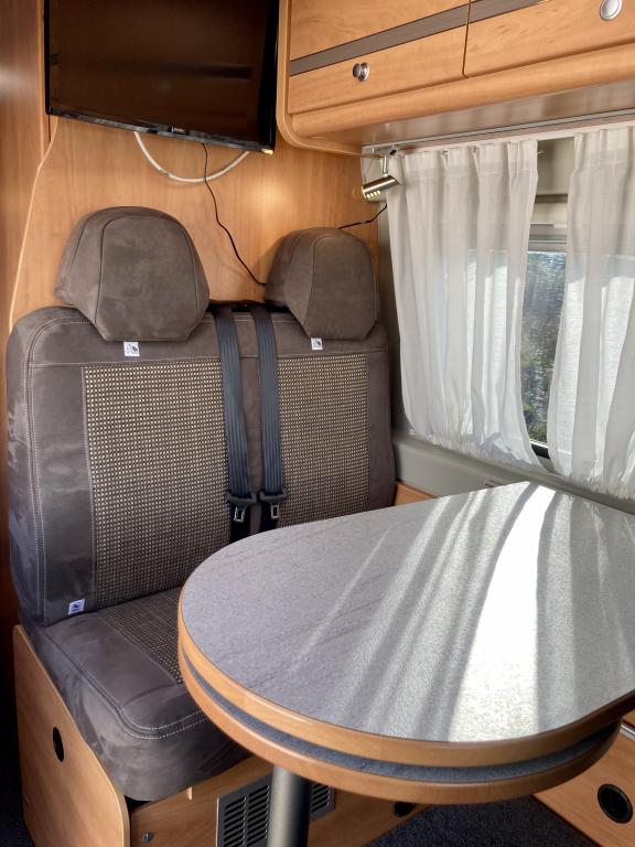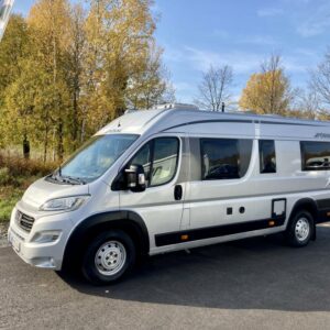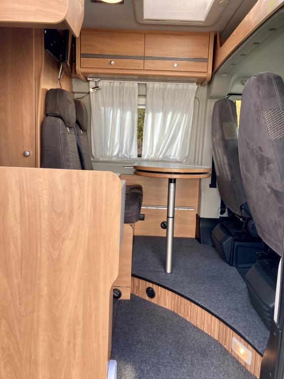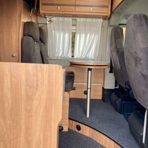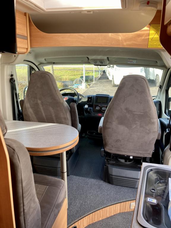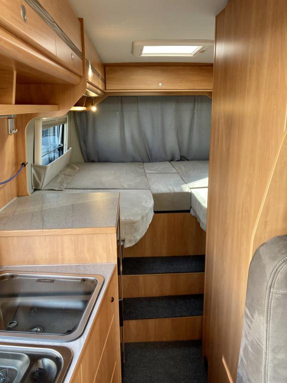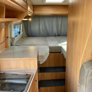 Pohjaratkaisussa edessä sohvaryhmä ja kääntyvät etuistuimet. Keskiosassa keittiö sekä wc -ja suihkutila. Takaosassa erillisvuoteet, jotka voi pedata yhdeksi suureksi parivuoteeksi.