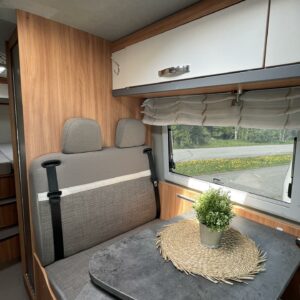 Auton etuosasta löytyy arvokkaan harmaa istuinryhmä neljälle. Iso kattoikkuna tuo luonnonvaloa sisälle. Varsinainen herkkupala löytyy auton takaosasta. Muhkeat, toisiinsa tarvittaessa yhdistettävät erillisvuoteet kutsuvat syleilyynsä ja tarjoavat rentouttavat yöunet. WC/ pesutilat ovat Pösslin innovatiivisuutta parhaimmillaan. Taittuvan seinän ansiosta pieneen tilaan on saatu toimivat tilat myös retkisuihkun ottamista varten.