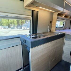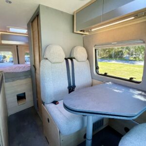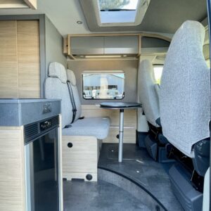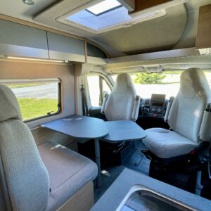 Auton etuosassa on pöytäryhmä kääntyvin etupenkein. Takaosasta löytyy parivuode. Parivuoteen alla on iso tavaratila.