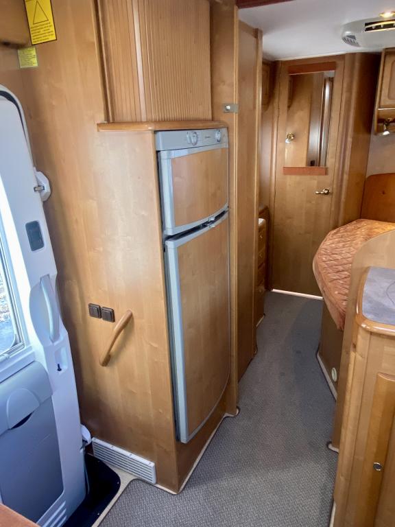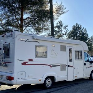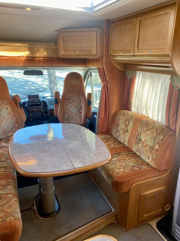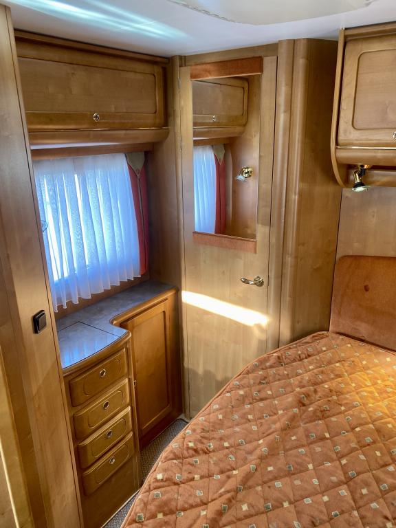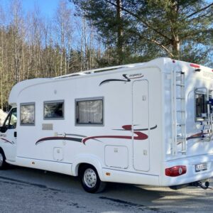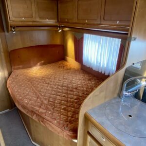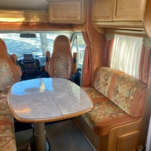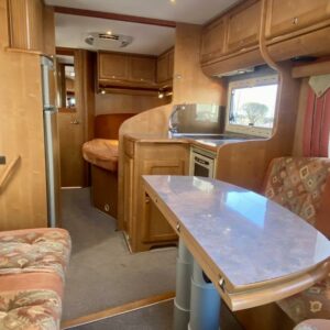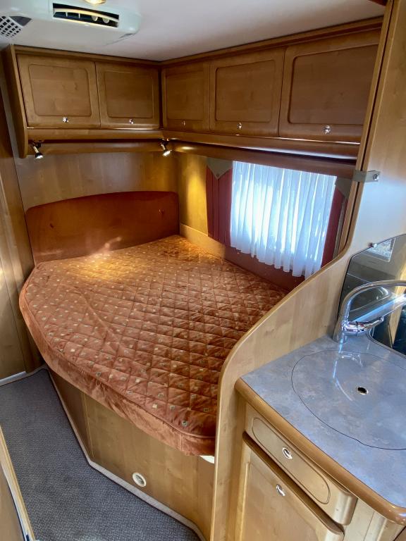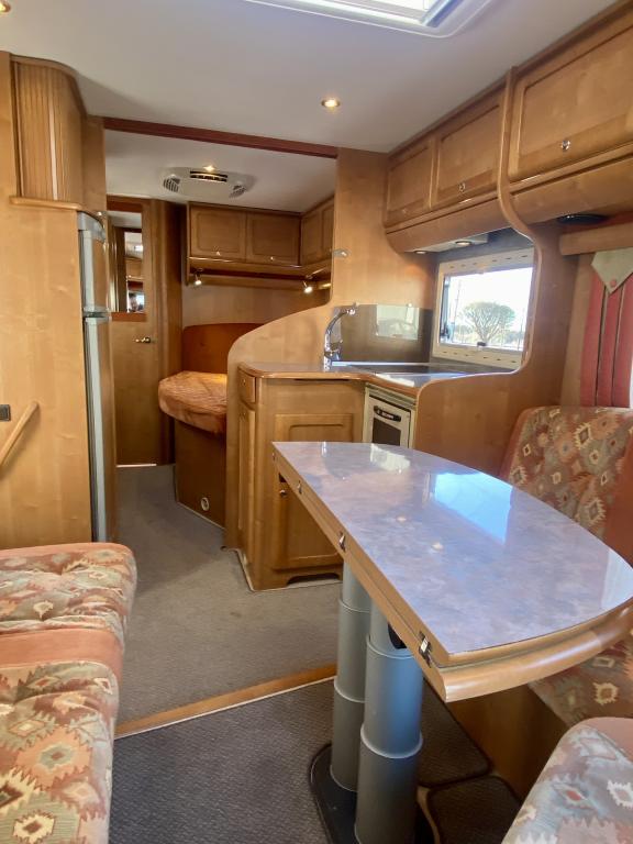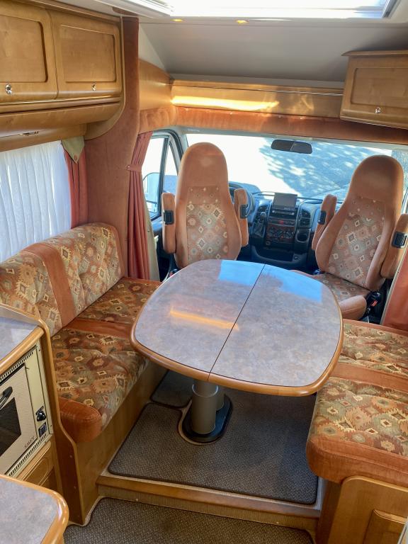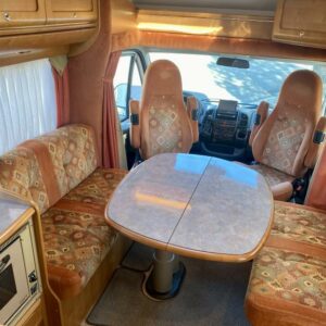 Auton takaosassa pitkittäinen parivuode ja tilavat WC/ peseytymistilat erillisellä suihkunurkkauksella. Auton etuosasta löytyy kahdella sivusohvalla varustetu pöytäryhmä jonka ympärille mahtuu helposti kuusikin henkeä iltaa istumaan. Keittiön varustuksen kruunaa iso jääkaappi ja kaasu- uuni.
