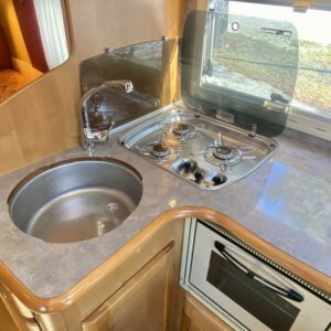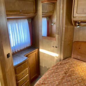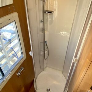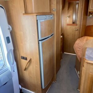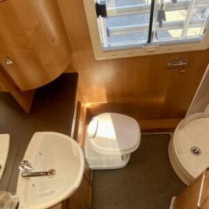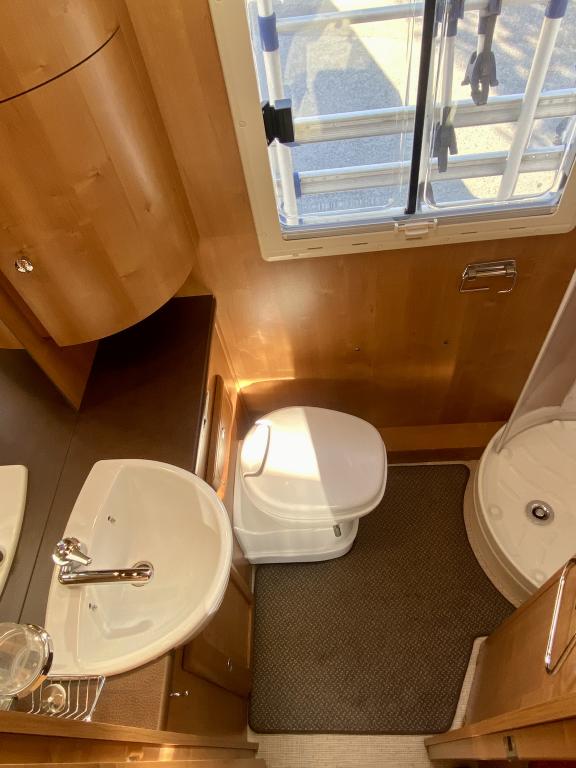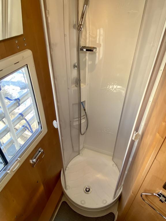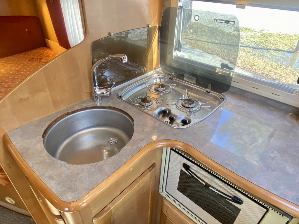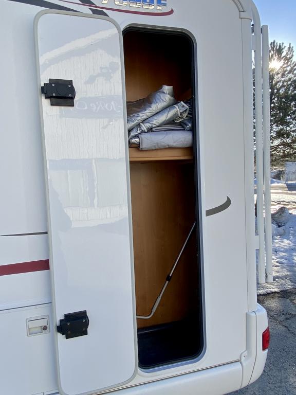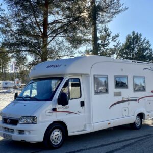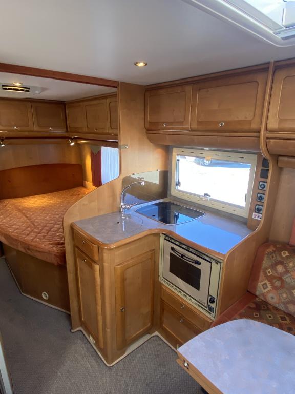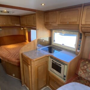Auton takaosassa pitkittäinen parivuode ja tilavat WC/ peseytymistilat erillisellä suihkunurkkauksella. Auton etuosasta löytyy kahdella sivusohvalla varustetu pöytäryhmä jonka ympärille mahtuu helposti kuusikin henkeä iltaa istumaan. Keittiön varustuksen kruunaa iso jääkaappi ja kaasu- uuni.