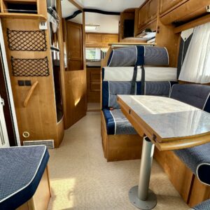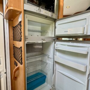 Keskeltä autoa löytyy keittiö, jonka varustukseen kuuluu ison jääkaappi- pakastimen lisäksi kaasu- uuni ja liesituuletin.