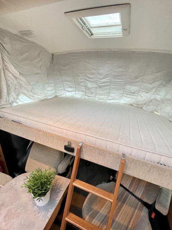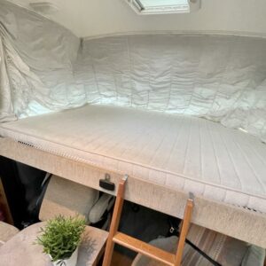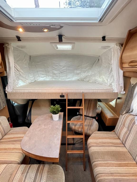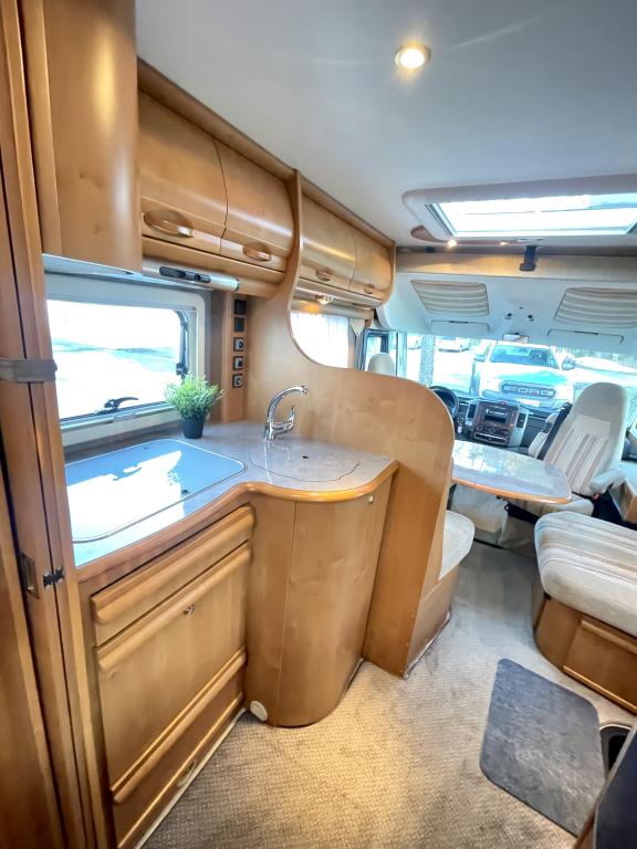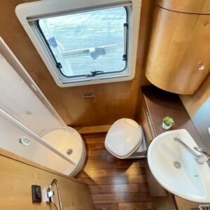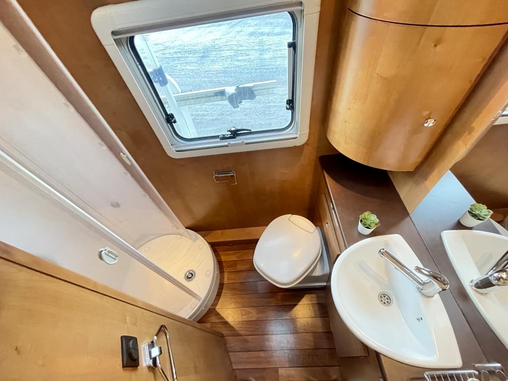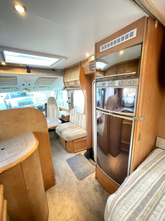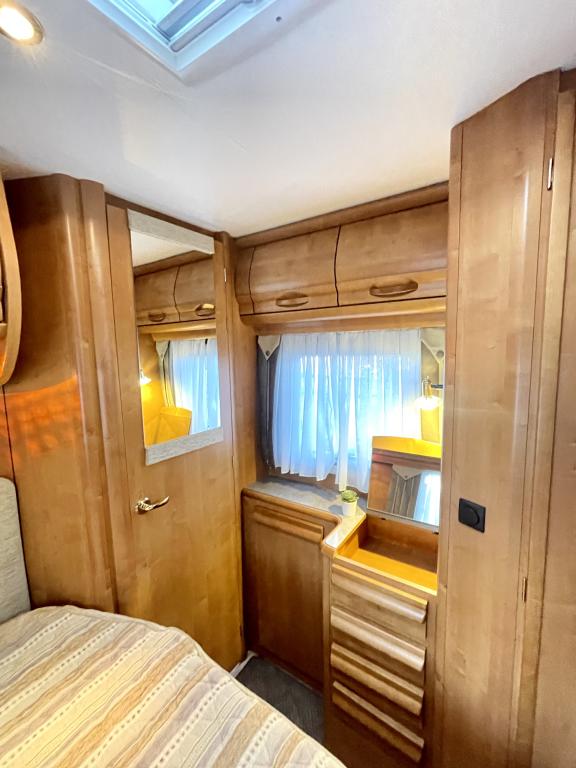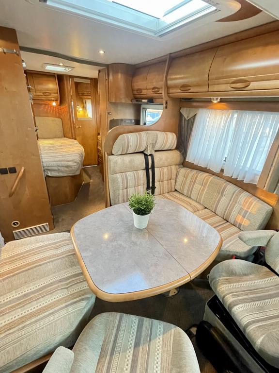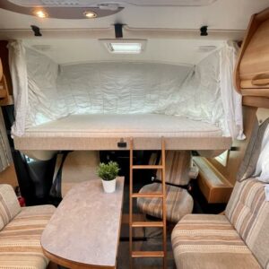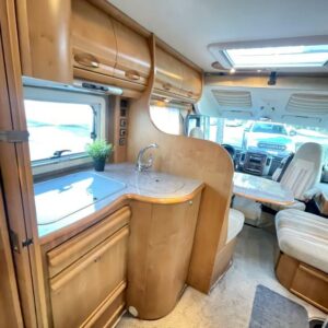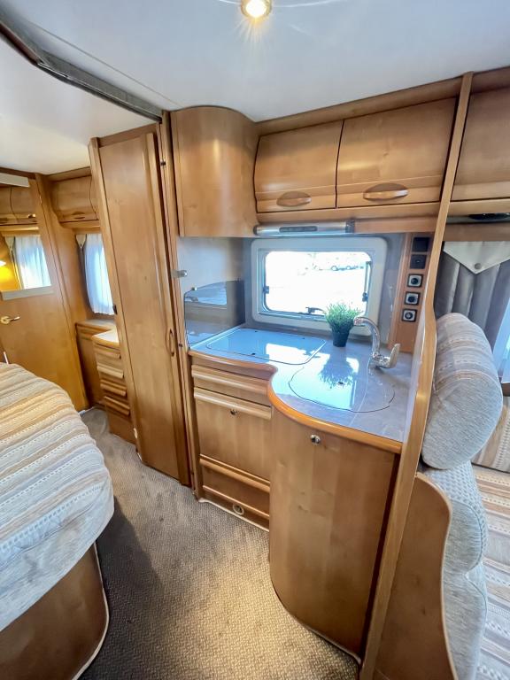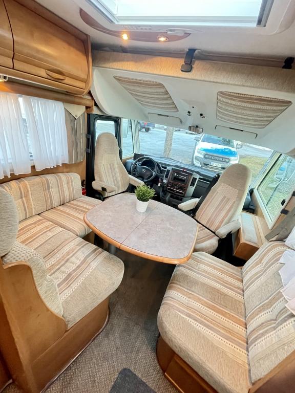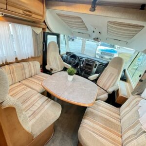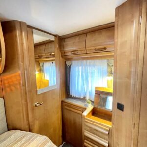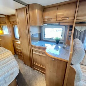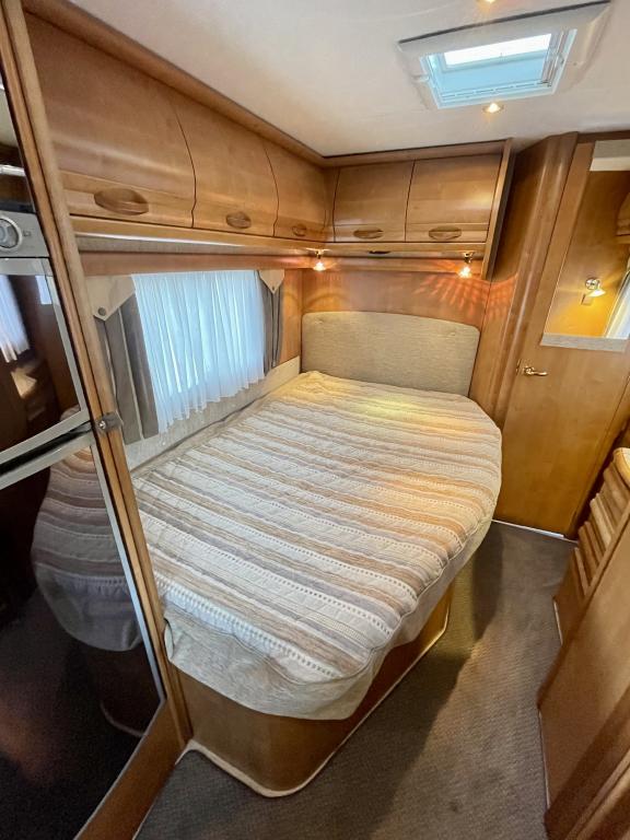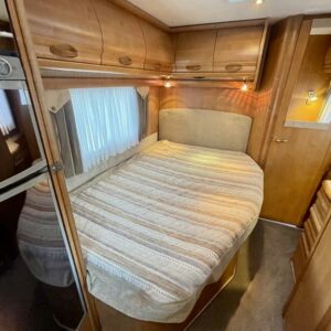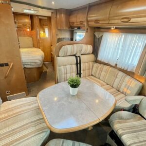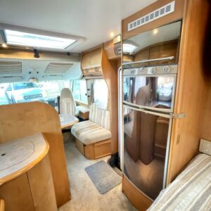 Takana hulppea pesuhuone ikkunalla, kampauspöytä sekä pitkittäinen parivuode. Keskellä keittiö jossa iso jääkaappi ja kaasu-uuni. Edessä istuinryhmä 5:lle kääntyvin ohjaamon penkein sekä ohjaamon päällä alaslaskettava parivuode.