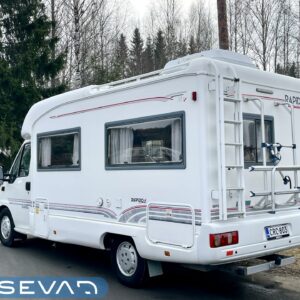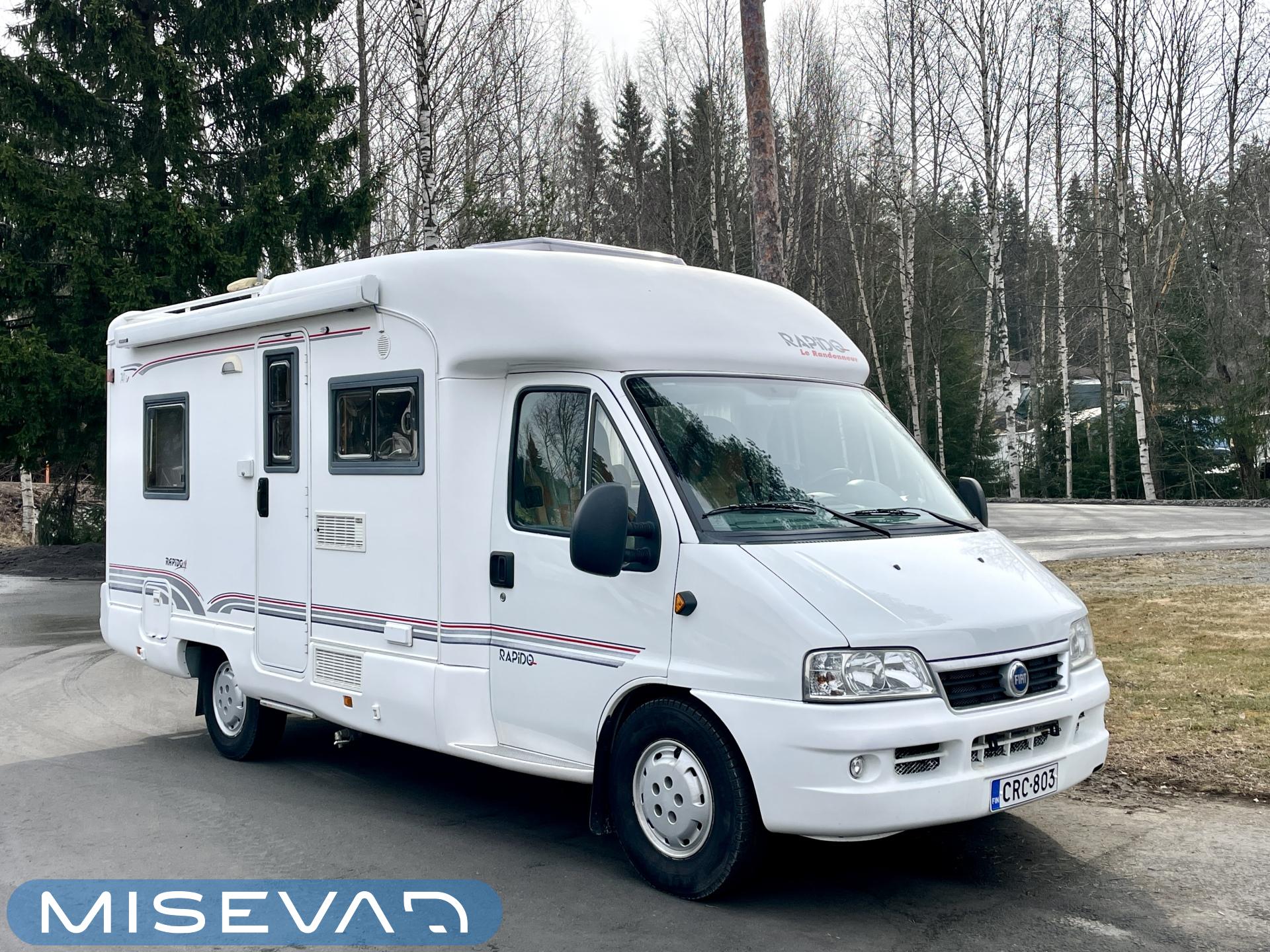 Tämä Rapido kulkee tiellä kuin juna, on muuten mukava ajettava! Tästä siistikuntoinen matka-auto matalalla pitkittäisellä parivuoteella ja ohjaamoilmastoinnilla. Asuinosan sisustus on ikäisekseen upeassa kunnossa. Auton takaosaan, missä reilut wc-tilat ja parivuode, muotoutuu liukuoven ansiosta ikään kuin makuuhuone. Saa kivasti omaa rauhaa, jos nukuttaa pidempään. Keskiosassa keittiön yhteydessä on pöytäryhmä, sekä kääntyvät ohjaamon penkit, jotka muodostavat mukavan kokoisen oleskelutilan. Keittiön varustukseen sisältyy myös liesituuletin. Huomaa että merkki on ranskalainen, sillä pöydän jalan sisään kätkeytyy pulloteline.