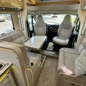 Auton etuosassa on tyylikkäästi verhoiltu L- istuinryhmä. Sivusohvan ja kääntyvien etuistuinten ansiosta pöydän ympärille mahtuu kivasti 7 -8 henkeä. Pöytäryhmän päälle saa tarvittaessa laskettua sähköavusteisesti nostovuoteen.