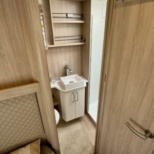 Takapäässä on mukavien erillisvuoteiden lisäksi toimivat pesuhuone/ WC- tilat erillisellä suihkunurkkauksella.