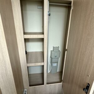 Keskemmältä autoa löytyy keittiö isolla jääkaappi- pakastimella ja liesituulettimella varustettuna.