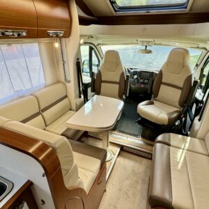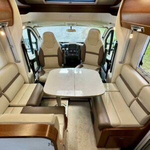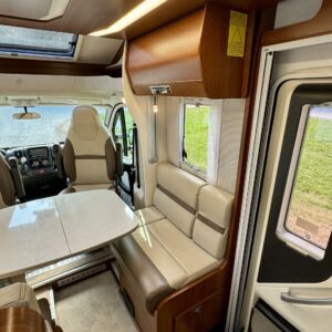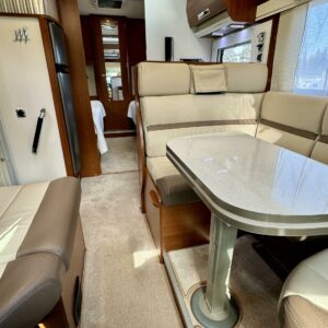 Auton etuosassa on tyylikkäästi verhoiltu L- istuinryhmä. Sivusohvan ja kääntyvien etuistuinten ansiosta pöydän ympärille mahtuu kivasti 7 -8 henkeä. Pöytäryhmän päälle saa tarvittaessa laskettua sähköavusteisesti nostovuoteen.
