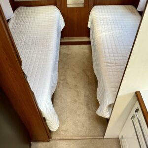 Takapäässä on mukavien erillisvuoteiden lisäksi toimivat pesuhuone/ WC- tilat erillisellä suihkunurkkauksella.