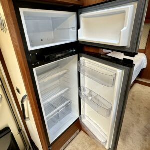 Keskemmältä autoa löytyy keittiö isolla jääkaappi- pakastimella varustettuna.