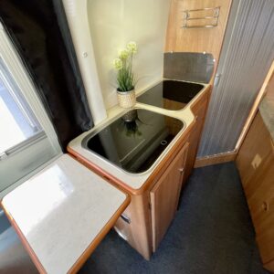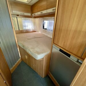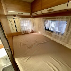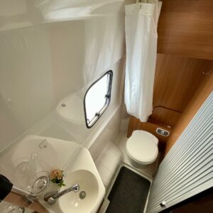Perällä sijaitseva tilava wc aivan vuoteen vieressä lisää asumismukavuutta ja tekee arjesta tien päällä helppoa. Käytännöllisyys kohtaa tyylin tavalla, jota harvemmin näkee tässä kokoluokassa.