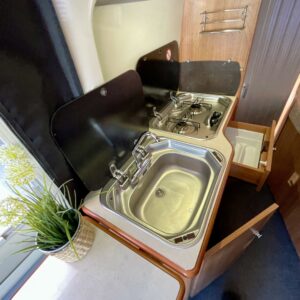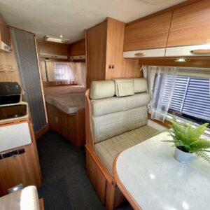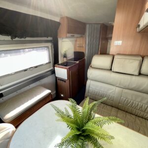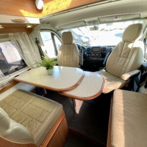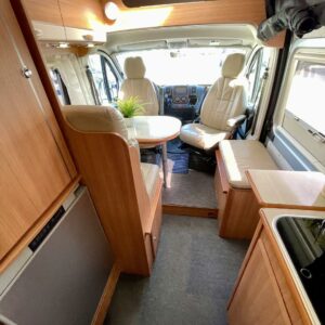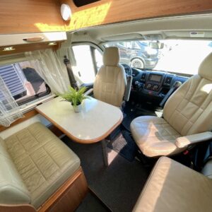 Sisätiloissa vastaan tulevat laadukkaat nahkaistuimet, jotka tuovat matkantekoon arvokasta tunnelmaa ja mukavuutta. Auton takaosassa sijaitsee kunnollinen ranskalainen pitkittäinen parivuode, jossa nukkuu levollisesti myös pidemmällä matkalla. Lisävuoteen patja löytyy jolla ruokailuryhmästä teet tilapäisvuoteen.