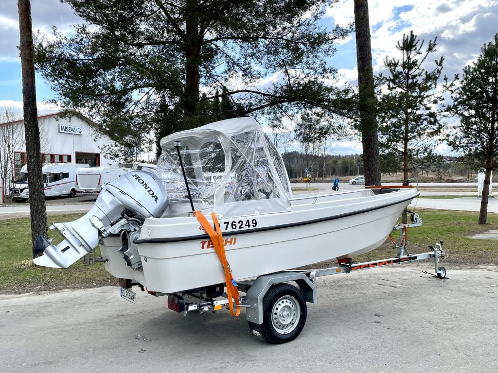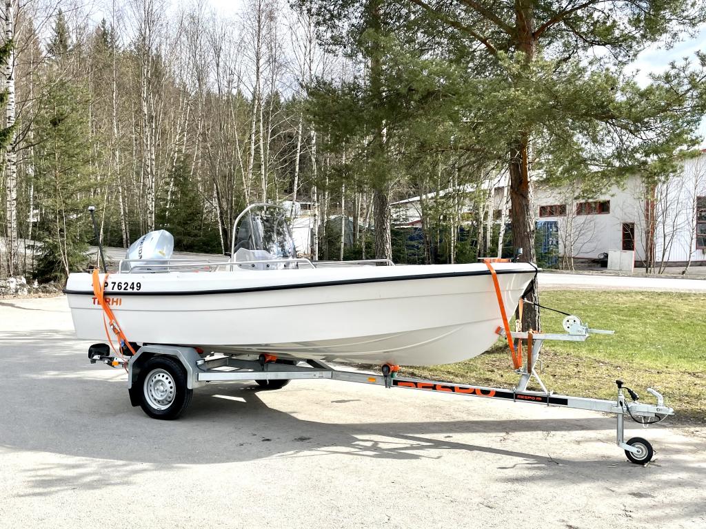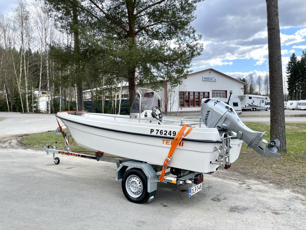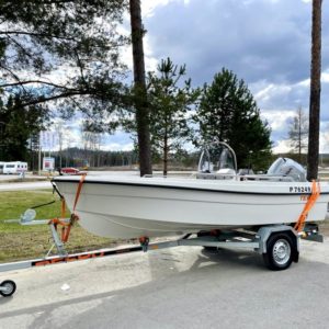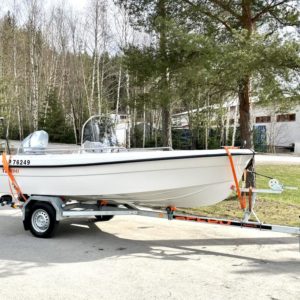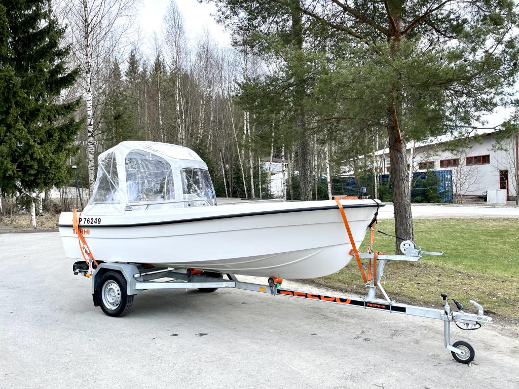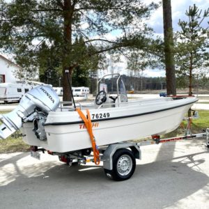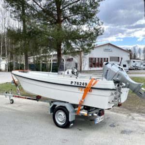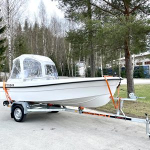 Hienokuntoinen vene-traileri-paketti. Moottorina Honda BF 40 DK2 LRTZ. Veneessä mukana kuomu ja airot. Trailerina Respo 750.
