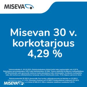 Misevan 30-vuotissyntymäpäivän johdosta kiinteä korko käytettyihin vain 4,29% jopa 72kk ajaksi. Kts. lisätiedot alta! - – – – – >