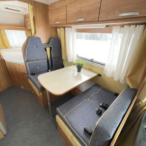 Kuudelle rekisteröity, matalalla parivuoteella ja perinteisellä 4 hengen pöytäryhmällä varustettu matka-auto edullisesti.