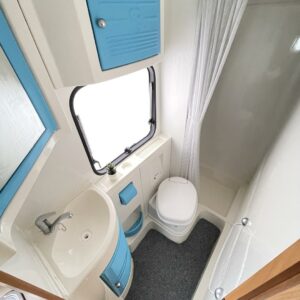 Auton takaosassa pitkittäinen parivuode ja tilava pesuhuone erillisellä suihkutilalla. Auton etuosasta löytyy pöytäryhmä neljälle. Turvavyölliset istumapaikat kuudelle.