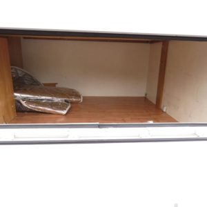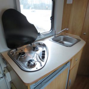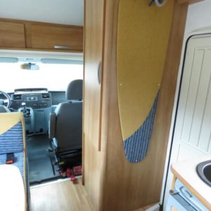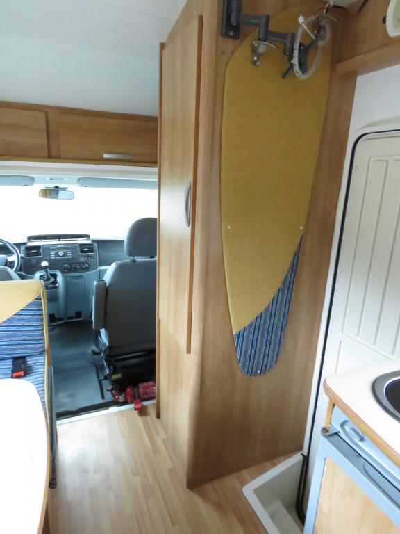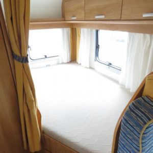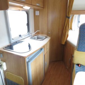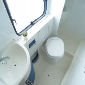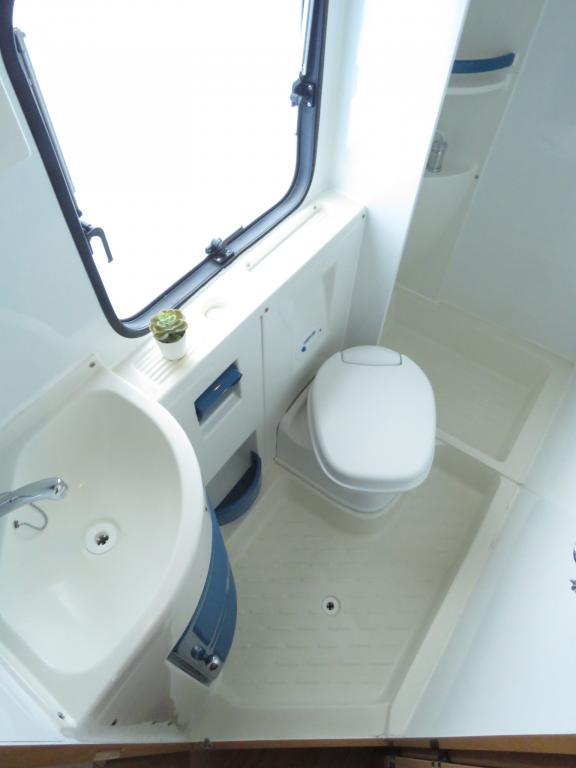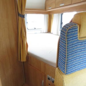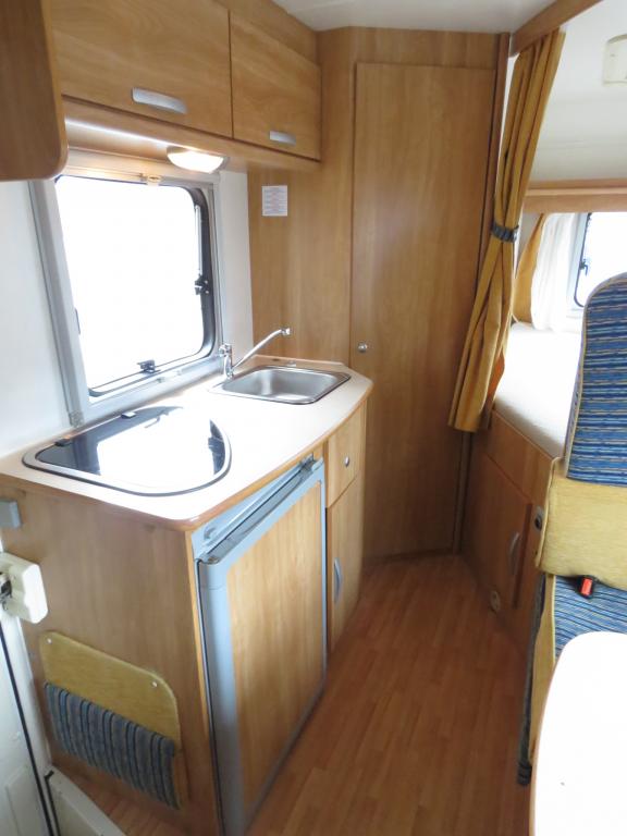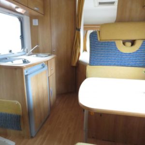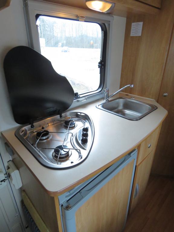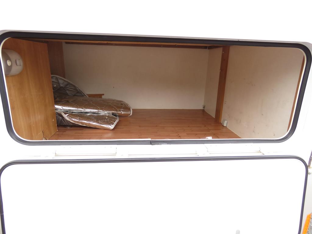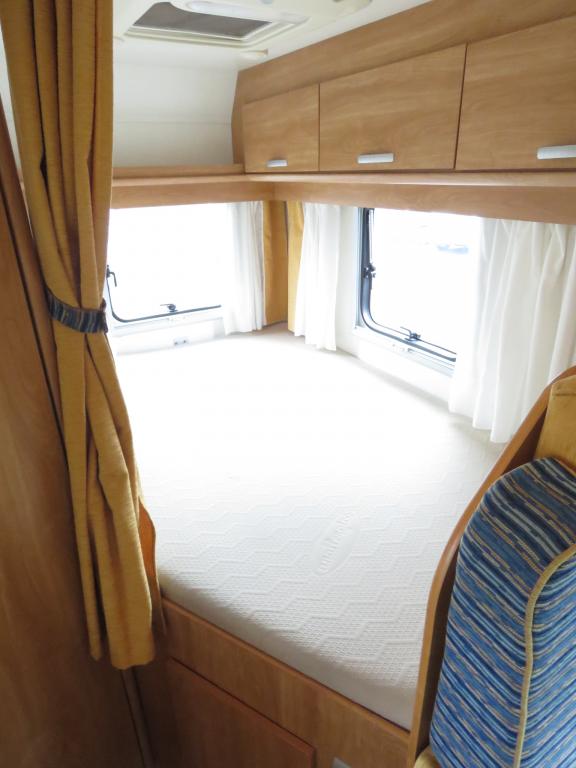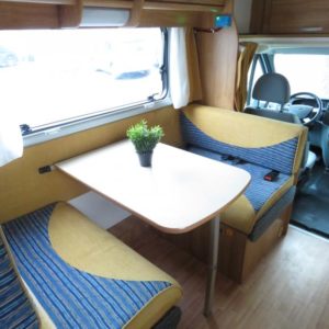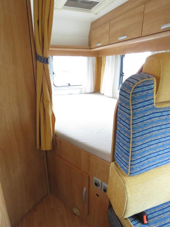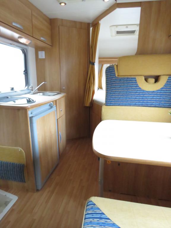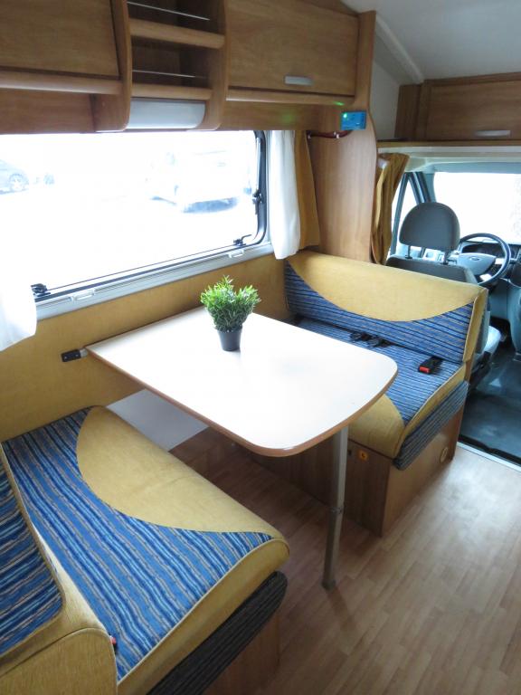 Auton takaosassa pitkittäinen parivuode ja tilava pesuhuone erillisellä suihkunurkkauksella, edessä perinteinen pöytäryhmä joka sijattavissa toiseksi parivuoteeksi.