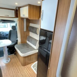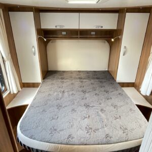 Takana saarekevuode, erilliset suihku- ja pesuhuoneet, alla hyvä tavaratila, keskellä keittiö isolla jääkaapilla, edessä istuinryhmä 5:lle ja päällä sähköisesti alaslaskettava parivuode.