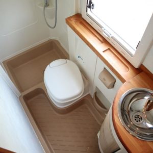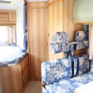Auton takaosassa pitkittäinen parivuode ja tilava pesuhuone/ WC, edessä vastakkainistuttava pöytäryhmä.