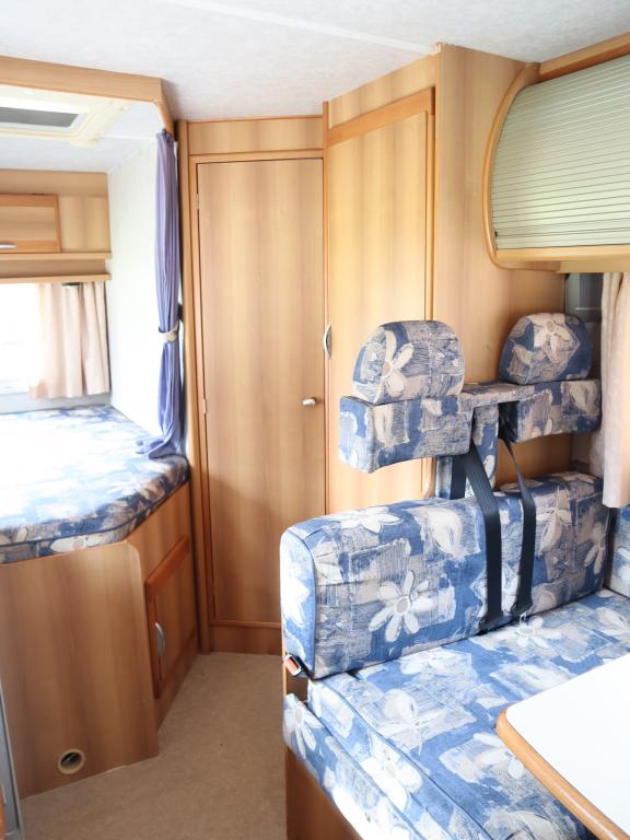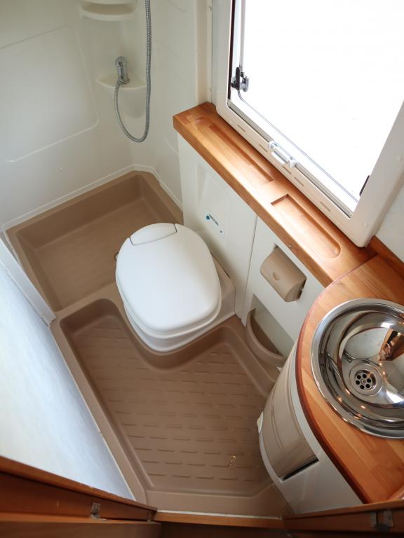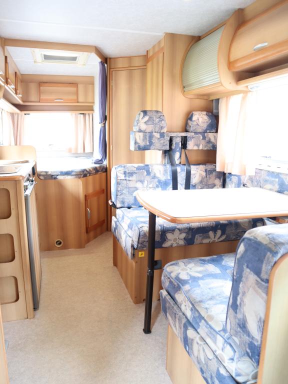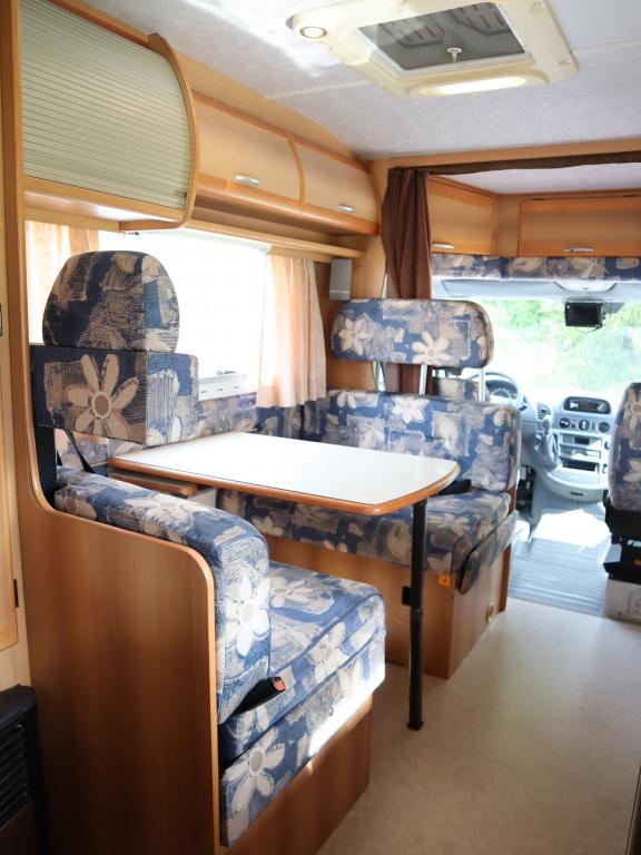 Auton takaosassa pitkittäinen parivuode ja tilava pesuhuone/ WC, edessä vastakkainistuttava pöytäryhmä.