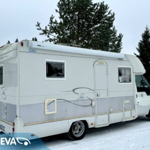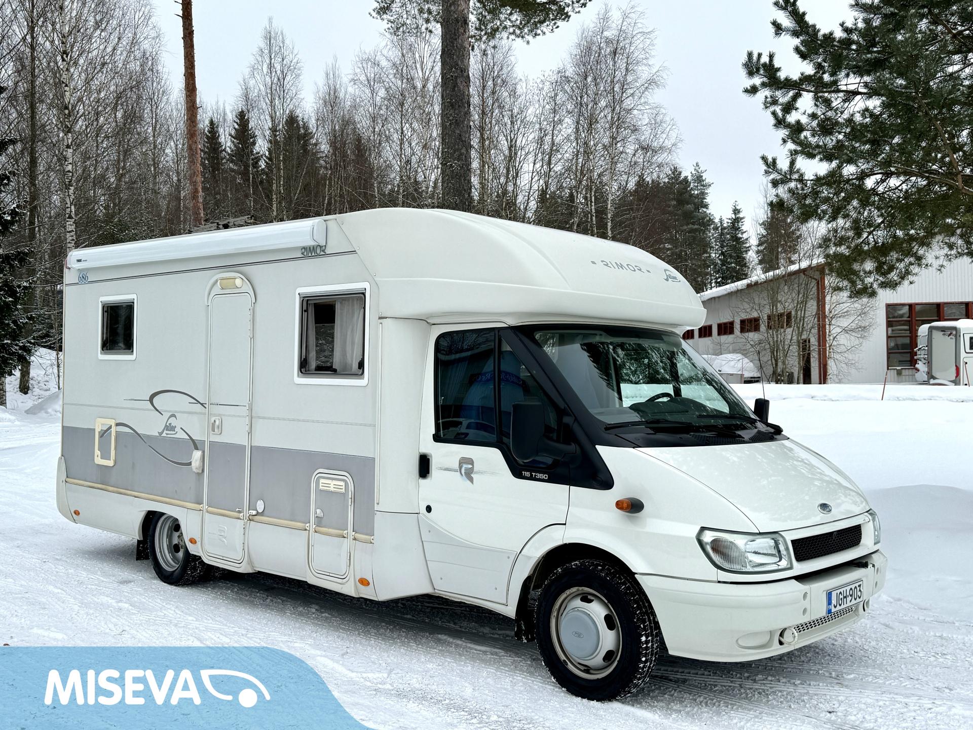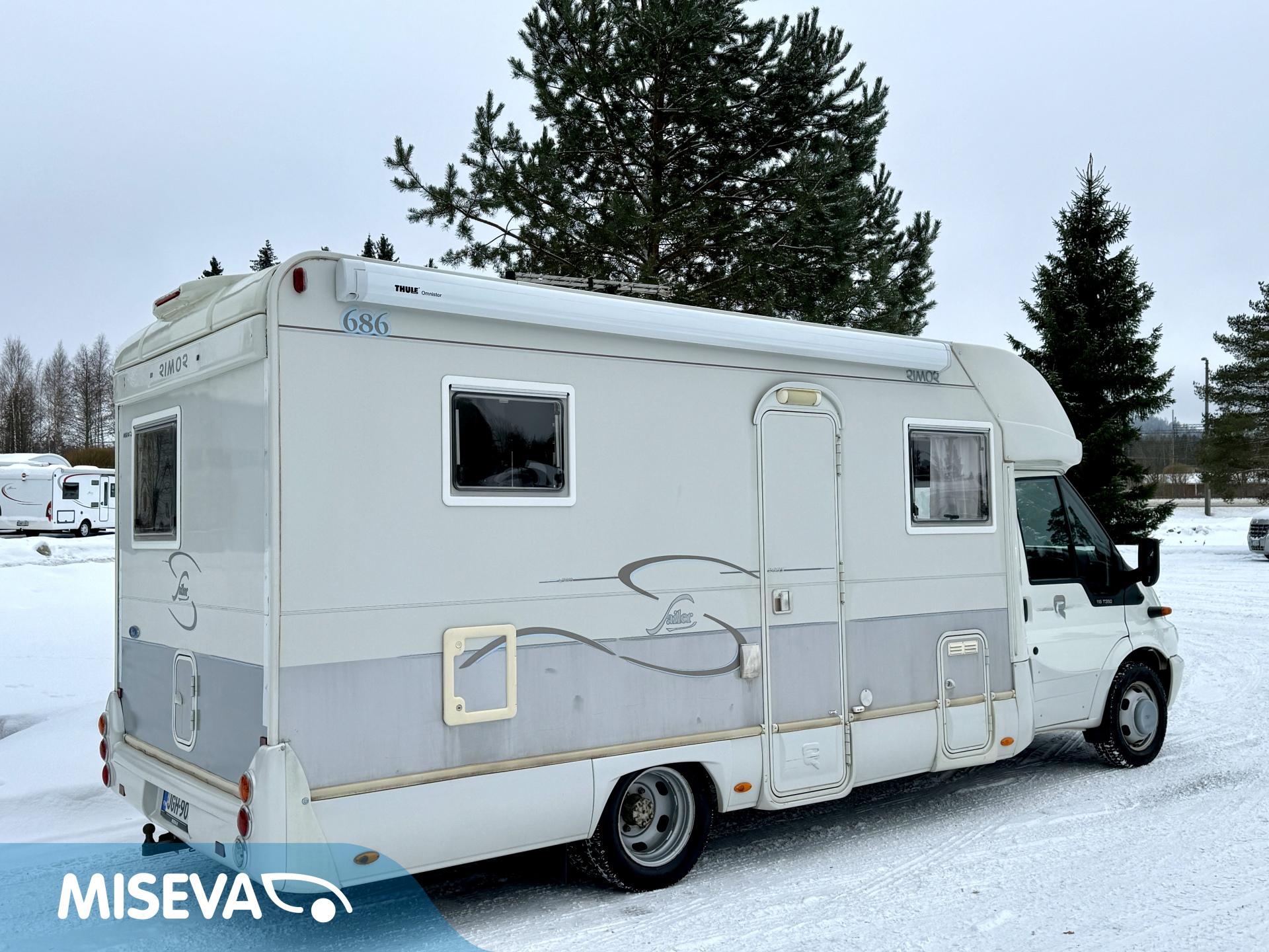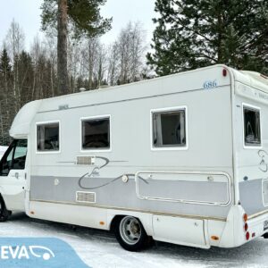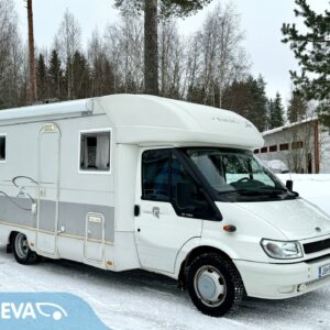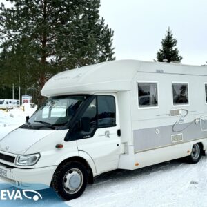 Ryhdikäs puoli- integroitu matka- auto Transitin paripyöräalustalla. Rekisteröity viidelle matkustajalle.