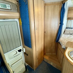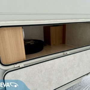 Auton etuosasta löytyy viihtyisä istuinryhmä pitkällä sivusohvalla. Pöydän ympärille mahtuu mukavasti 6 henkeä seuraavaa matkakohdetta suunnittelemaan. Pöytäryhmästä saa tarvittaessa sijattua toisen parivuoteen.