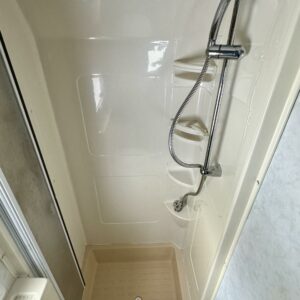 Takaosassa on pitkittäinen parivuode ja tilava pesuhuone/ WC erillisellä suihkunurkkauksella.,