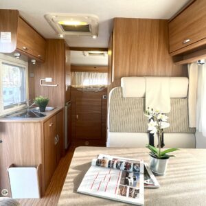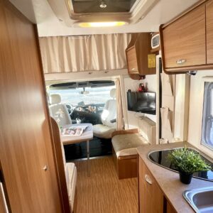 Autoon astuessa ensimmäisenä kiinnittää huomiota tilan tuntuun ja asuintilan avoimuuteen. Vaaleat sävyt korostavat erityisesti kokonaisuuden valoisuutta. Mukaan mahtuu neli henkinen perhe tai tilaa kaipaava porukka, kaikille löytyy autosta oma nukkumapaikka. Kääntyvät etupenkit mahdollistavat sen että koko kööri mahtuu saman aamupalapöydän ääreen. WC-/suihkutila on myös mukavan tilava isossa autossa, eikä siinä ole jouduttu tinkimään. Keittiöstä löytyy kaapistoa vaikka muille jakaa. Kaiken kokonaisuuden ja tilan kruunaa vielä iso takatalli. Ei jää pihapelit ja lempituolit matkasta, kaiken saa kyytiin tähän kiesiin.